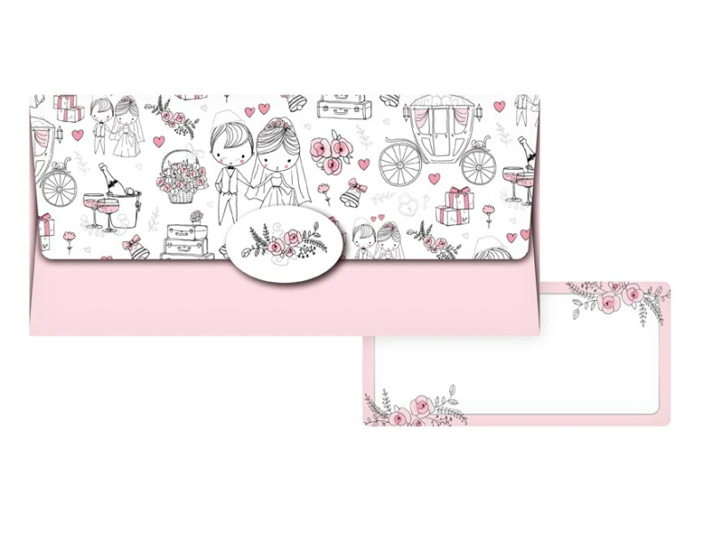 Darčeková obálka na peniaze pre novomanželov – Urobte novomanželom radosť a venujte im obálku s peniazmi alebo darčekovým poukazom. Vnútri je kartička bez textu, na ktorú môžete napísať venovanie. PREVEDENIE: bielo ružová obálka s obrázkami Dodávame v plastom vrecku so závesom. Uvedená cena je za 1 ks.
