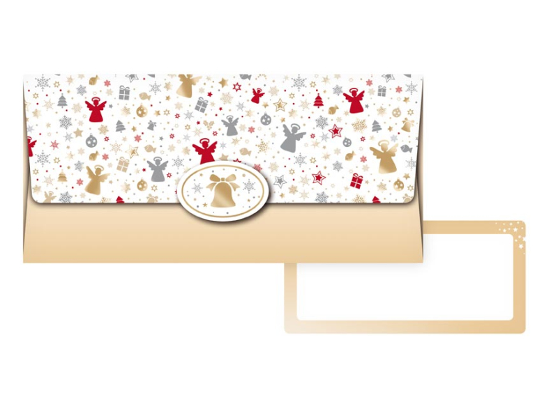 Darčeková obálka na peniaze s vianočným motívom a uzatvárateľnou chlopňou. Obdarujte svojich blízkych na Vianoce obálkou na peniaze. Do obálky môžete vložiť peniaze alebo darčekovú poukážku. Vo vnútri je kartička bez textu, na ktorú môžete napísať venovanie. Farba: béžová/biela Motív: anjeli, darčeky, ozdoby Dodávame v plastom vrecku so závesom. Uvedená cena je za 1 ks.