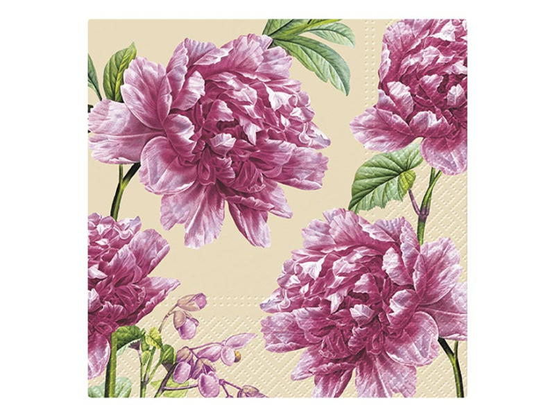 Trojvrstvový papierový obrúsok. Krásne kvalitné obrúsky s motívom pivoniek vyčarujú príjemnú atmosféru. Ideálne na záhradné prestieranie, oslavy alebo výzdobu interiéru. MOTÍV: pivonky POČET OBRÚSKOV V BALENÍ: 20 ks Uvedená cena je za 1 balenie po 20 ks.