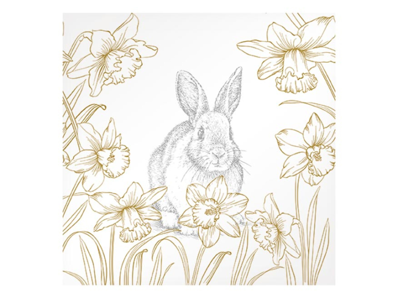 Papierový veľkonočný obrúsok. Servítky so zajačikom ukrytým za zlatými narcismi krásne doplnia váš sviatočne prestretý stôl. Servítky sú z veľmi kvalitného trojvrstvového papiera. Vhodné aj na obrúskovú techniku. MOTÍV: zajačik, narcisy POČET OBRÚSKOV V BALENÍ: 20 ks Uvedená cena je za 1 balenie po 20 ks.