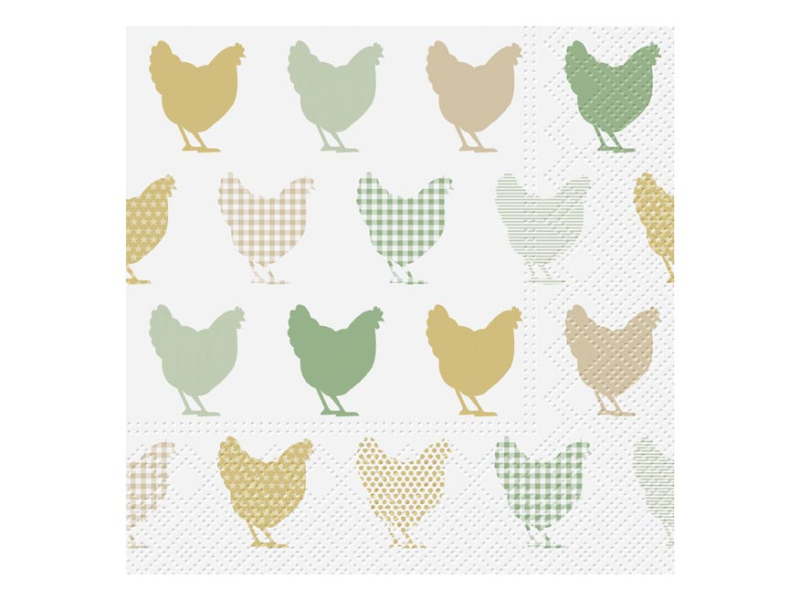 Papierový veľkonočný obrúsok. Obrúsky s motívom sliepočiek s rôznym vzorom vás naladia na pocit vidieka aj u vás doma. Obrúsok je kvalitný z trojvrstvového papiera. Vhodný aj na servítkovú techniku. MOTIV: sliepočky s rôznymi vzormi POČET OBRÚSKOV V BALENÍ: 20 ks Uvedená cena je za 1 ks balenia po 20 ks.