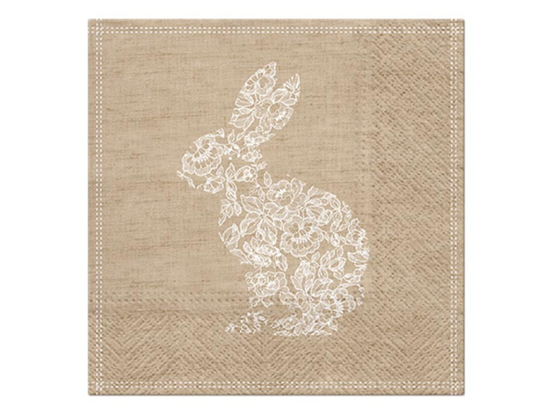 Papierový veľkonočný obrúsok. Servítky v prírodnom vzhľade s motívom čipkovaného zajačika krásne doplnia váš interiér. Servítky sú z veľmi kvalitného trojvrstvového papiera. Vhodné aj na obrúskovú techniku. MOTÍV: zajačik POČET OBRÚSKOV V BALENÍ: 20 ks Uvedená cena je za 1 balenie po 20 ks.