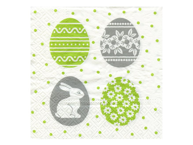 Papierový veľkonočný obrúsok. Obrúsok je kvalitný z trojvrstvového papiera. Krásne veľkonočné obrúsky dodajú prestretému stolu nádych prichádzajúcej jari a vyčaria príjemnú atmosféru pri slávnostnom obede alebo pri večeri. MOTIV: zelené a šedé kraslice POČET OBRÚSKOV V BALENÍ: 20 ks Uvedená cena je za 1 balenie po 20 ks.