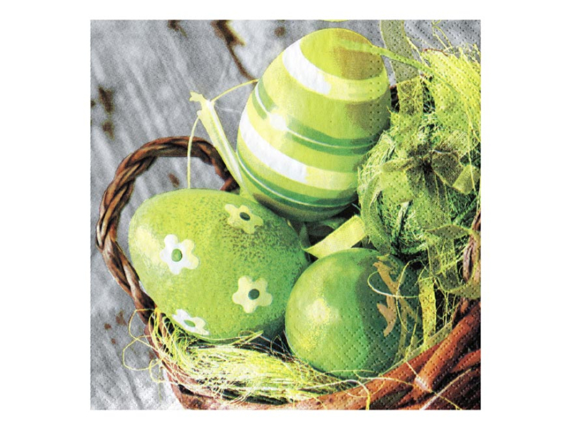 Papierový veľkonočný obrúsok. Obrúsok je z trojvrstvového papiera. Krásne veľkonočné obrúsky dodajú prestretému stolu nádych prichádzajúcej jari a vyčaria príjemnú atmosféru pri slávnostnom obede alebo pri večeri. MOTIV: zelené kraslice POČET OBRÚSKOV V BALENÍ: 20 ks Uvedená cena je za 1 balenie po 20 ks.