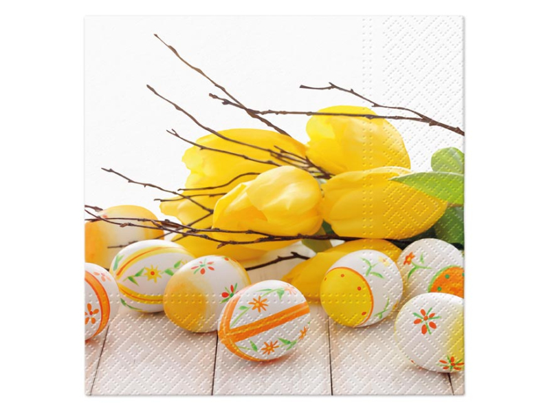 Papierový veľkonočný obrúsok. Krásne veľkonočné obrúsky s obrázkami veľkonočných vajíčok a tulipánov dodajú prestretému stolu nádych jari a vyčarujú príjemnú atmosféru pri slávnostnom obede alebo večeri. Obrúsok je vyrobený z kvalitného trojvrstvového papiera. Vhodné aj na obrúskovú techniku a rôzne dekorácie. MOTÍV: veľkonočné vajíčka, tulipány POČET OBRÚSKOV V BALENÍ: 20 ks Uvedená cena je za 1 balenie po 20 ks.