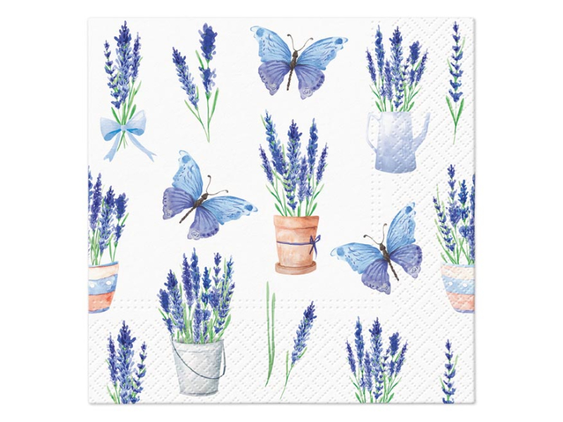 Papierový veľkonočný obrúsok. Krásne veľkonočné obrúsky s obrázkami levandule a motýľov dodajú prestretému stolu nádych jari a vyčarujú príjemnú atmosféru pri slávnostnom obede alebo večeri. Obrúsok je vyrobený z kvalitného trojvrstvového papiera. Vhodné aj na obrúskovú techniku a rôzne dekorácie. MOTÍV: levanduľa, motýle POČET OBRÚSKOV V BALENÍ: 20 ks Uvedená cena je za 1 balenie po 20 ks.