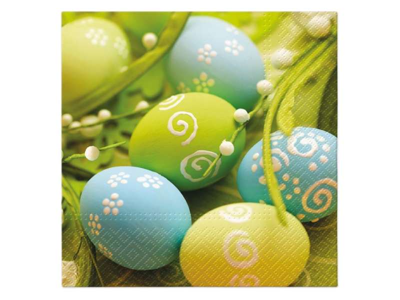Papierový veľkonočný obrúsok. Krásne veľkonočné obrúsky s obrázkami veľkonočných vajíčok dodajú prestretému stolu nádych jari a vyčarujú príjemnú atmosféru pri slávnostnom obede alebo večeri. Obrúsok je vyrobený z kvalitného trojvrstvového papiera. Vhodné aj na obrúskovú techniku a rôzne dekorácie. MOTÍV: veľkonočné vajíčka POČET OBRÚSKOV V BALENÍ: 20 ks Uvedená cena je za 1 balenie po 20 ks.