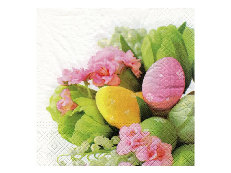 Papierový veľkonočný obrúsok. Obrúsok je z trojvrstvového papiera. Krásne veľkonočné obrúsky dodajú prestretému stolu nádych prichádzajúcej jari a vyčaria príjemnú atmosféru pri slávnostnom obede alebo pri večeri. MOTIV: kraslice a kvety POČET OBRÚSKOV V BALENÍ: 20 ks Uvedená cena je za 1 balenie po 20 ks.