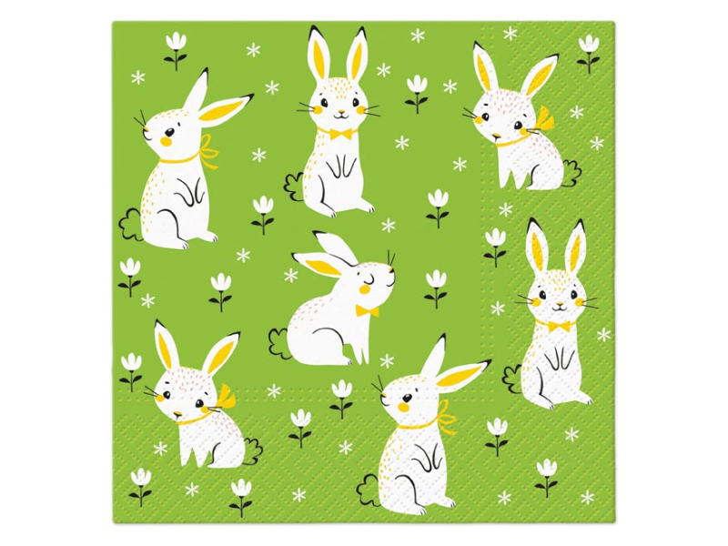 Papierový veľkonočný obrúsok. Krásne veľkonočné obrúsky s obrázkami zajačikov dodajú prestretému stolu nádych jari a vyčarujú príjemnú atmosféru pri slávnostnom obede alebo večeri. Obrúsok je vyrobený z kvalitného trojvrstvového papiera. Vhodné aj na obrúskovú techniku a rôzne dekorácie. FARBA: zelená MOTÍV: zajačikovia POČET OBRÚSKOV V BALENÍ: 20 ks Uvedená cena je za 1 balenie po 20 ks.
