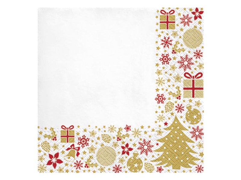 Papierový vianočný obrúsok s motívom vianočných symbolov, ako sú darčeky, stromčeky, snehové vločky a ozdoby. Tieto prvky sú usporiadané okolo troch rohov, zatiaľ čo zvyšok obrúska zostáva biely, čo vytvára elegantný a čistý vzhľad. Je vyrobený z kvalitného trojvrstvového papiera. Tento obrúsok možno použiť na slávnostné stolovanie počas vianočných sviatkov. Okrem toho môže slúžiť aj ako dekoratívny prvok vo vianočných dekoráciách. MOTÍV: Vianočné symboly POČET OBRÚSOK V BALENÍ: 20 ks Uvedená cena je za 1 balenie po 20 ks.