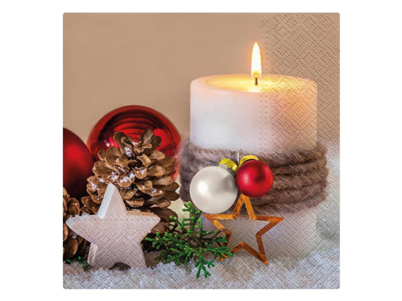 Papierový vianočný obrúsok s motívom sviečky a ozdôb. Je vyrobený z kvalitného trojvrstvového papiera. Tento obrúsok je ideálny na vianočné stolovanie, kde motív zapálenej sviečky spolu s tradičnými ozdobami vytvorí hrejivú, útulnú atmosféru. Vhodný na slávnostné večere alebo sviatočné stretnutia s rodinou a priateľmi. MOTÍV: sviečka, vianočné ozdoby POČET OBRÚSOK V BALENÍ: 20 ks Uvedená cena je za 1 balenie po 20 ks.