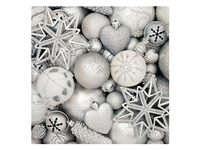 Papierový vianočný obrúsok s elegantným motívom vianočných ozdôb. Je vyrobený z kvalitného trojvrstvového papiera. Tento obrúsok je ideálny na elegantné vianočné stolovanie, kde jeho strieborno-biely motív dodá stolu nádych luxusu a noblesy. Je ideálny na slávnostné večere alebo iné vianočné udalosti, pri ktorých chcete vytvoriť slávnostnú a štýlovú atmosféru. MOTÍV: vianočné dekorácie POČET OBRÚSOK V BALENÍ: 20 ks Uvedená cena je za 1 balenie po 20 ks.