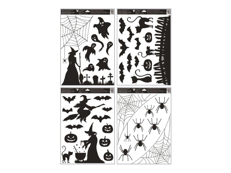 Dekoračná okenná fólia strašidelný Halloween. Obsahuje siluety čarodejníc, duchov, netopierov, pavúkov a pavučín, ktoré jednoducho premenia akýkoľvek priestor na temné a tajomné miesto. Fólia je samolepiaca, ľahko sa aplikuje a po odstránení nezanecháva žiadne stopy, takže je vhodná aj na opakované použitie. Táto výzdoba je ideálnou voľbou pre tých, ktorí chcú rýchlo a jednoducho vytvoriť pôsobivú Halloweensku atmosféru. NÁVOD: 1. Zlúpnite z podložky obrázok a umiestnite na čisté, prípadne navlhčené sklo stranou, ktorá bola na podložke. 2. Obrázok elektrostaticky priľne. 3. Fólia sa ľahko zlúpne a dá sa premiestniť. Rozmer: 350 x 500 mm Dodávame v mixe po 4 ks podľa skladovej zásoby. Uvedená cena je za 1 ks.