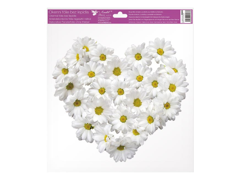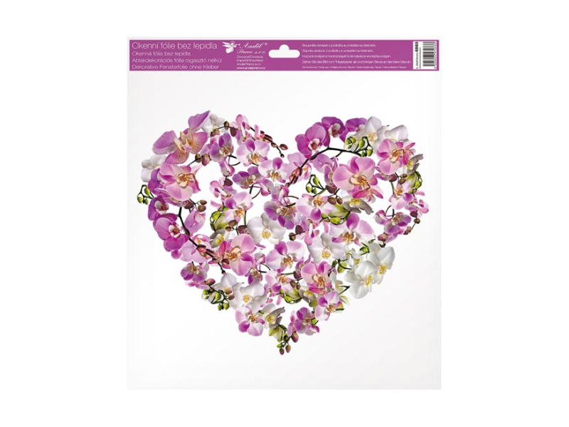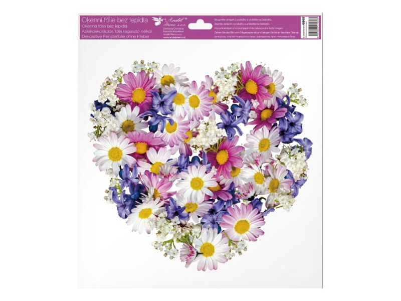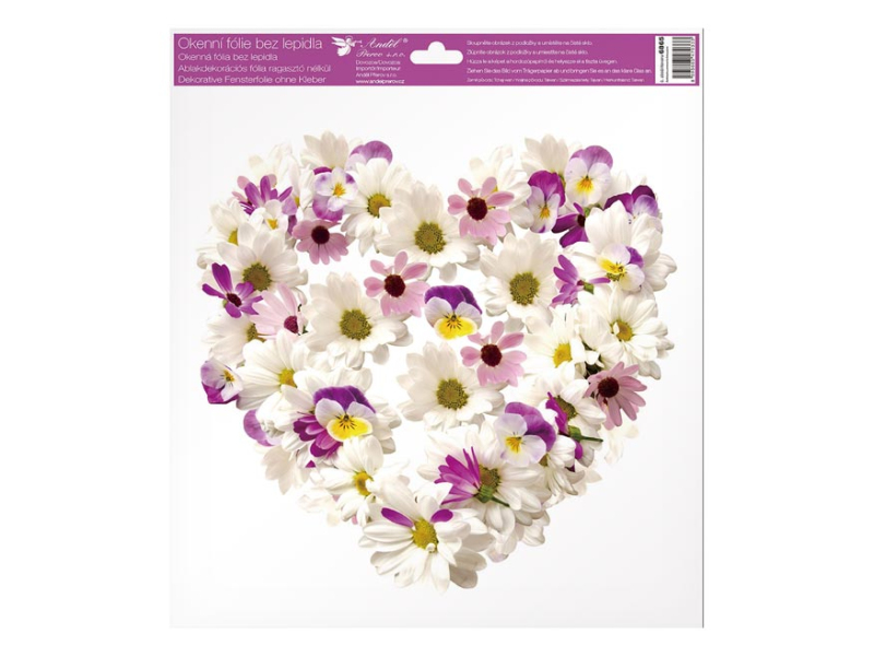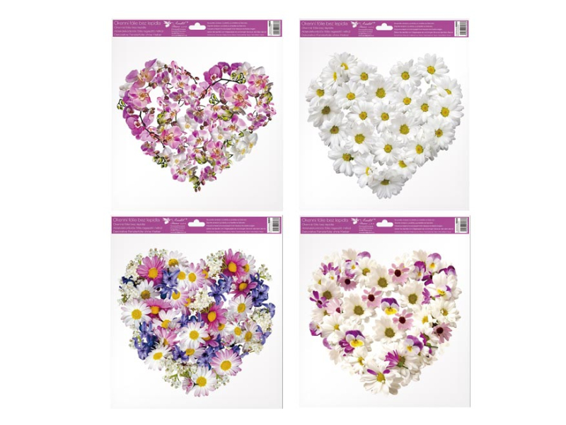 Dekoračná okenná fólia - srdce z kvetov. Okenné fólie neobsahujú lepidlo. Na plochu priľnú elektrostaticky a nezanechávajú teda po sebe žiadnu stopu. Vhodné sú akékoľvek hladké plochy, napríklad sklo, výlohy, zrkadlá alebo kachličky. Čisté - bez lepidla - opakovane použiteľné. NÁVOD: 1. Odporúčame pred použitím plochu očistiť od prachu a iných nečistôt. 2. Fólia sa ľahko aplikuje sňatím z podkladového papiera a umiestnením na hladkú plochu. 3. Fóliu priložte a vyhlaďte prípadné bublinky rukou alebo suchou handričkou. 4. Po použití je možné ich uložiť na pôvodný podkladový papier a uskladniť na ďalšiu sezónu. Dodávame v mixe po 4 ks podľa skladovej zásoby. Uvedená cena je za 1 ks.