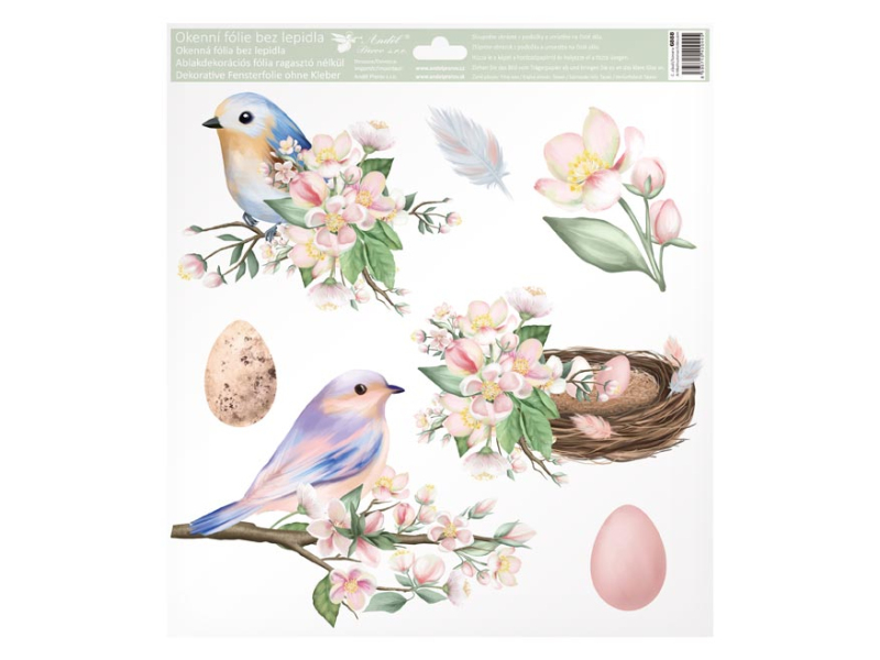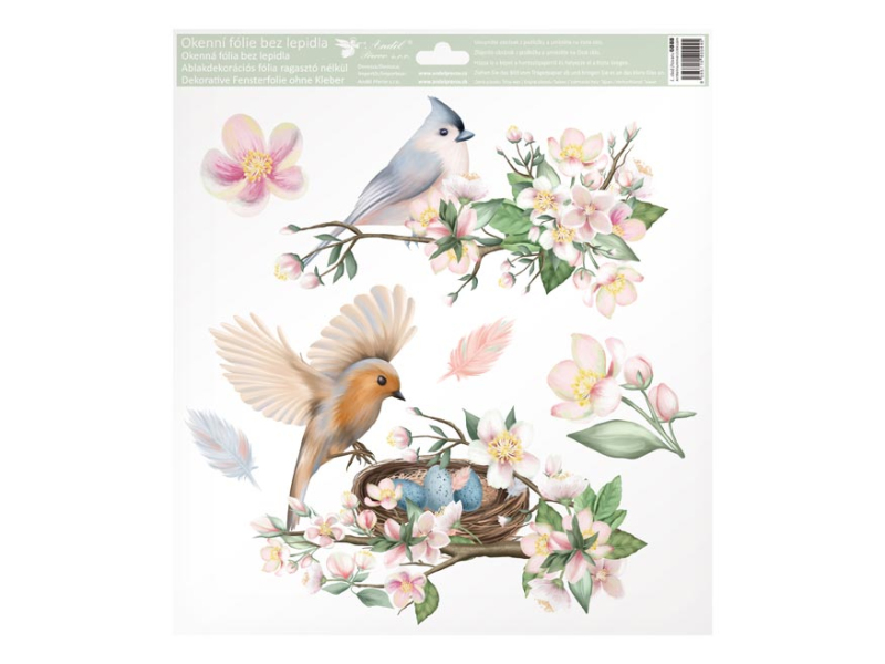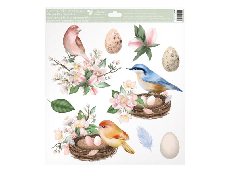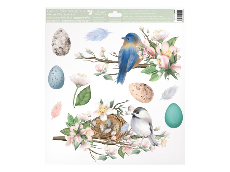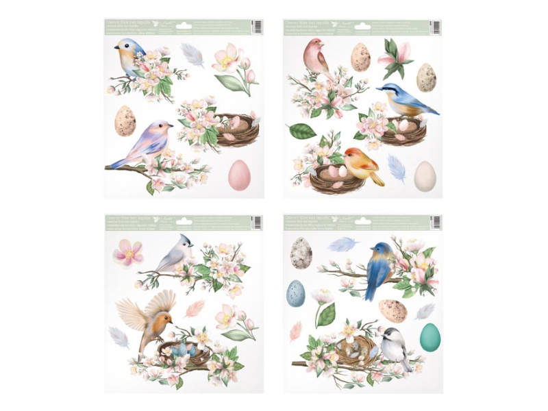Dekoratívna okenná fólia vtáky s trblietkami. Krásne okenné fólie s obrázkami pestrofarebných vtákov na rozkvitnutých vetvách s trblietkami. Na povrch sa prilepia elektrostaticky a nezanechávajú žiadne stopy. Vhodný je akýkoľvek hladký povrch, napríklad sklo, výklady, zrkadlá alebo dlaždice. Čisté - bez lepidla - opakovane použiteľné. NÁVOD: 1. Pred použitím sa odporúča očistiť povrch od prachu a iných nečistôt. 2. Fólia sa ľahko aplikuje odstránením z podkladového papiera a umiestnením na hladký povrch. 3. Fóliu naneste a prípadné bubliny vyhlaďte rukou alebo suchou handričkou. 4. Po použití ich možno umiestniť na pôvodný podkladový papier a uskladniť na ďalšiu sezónu. Dodávame v mixe 4 ks podľa skladových zásob. Uvedená cena je za 1 ks.