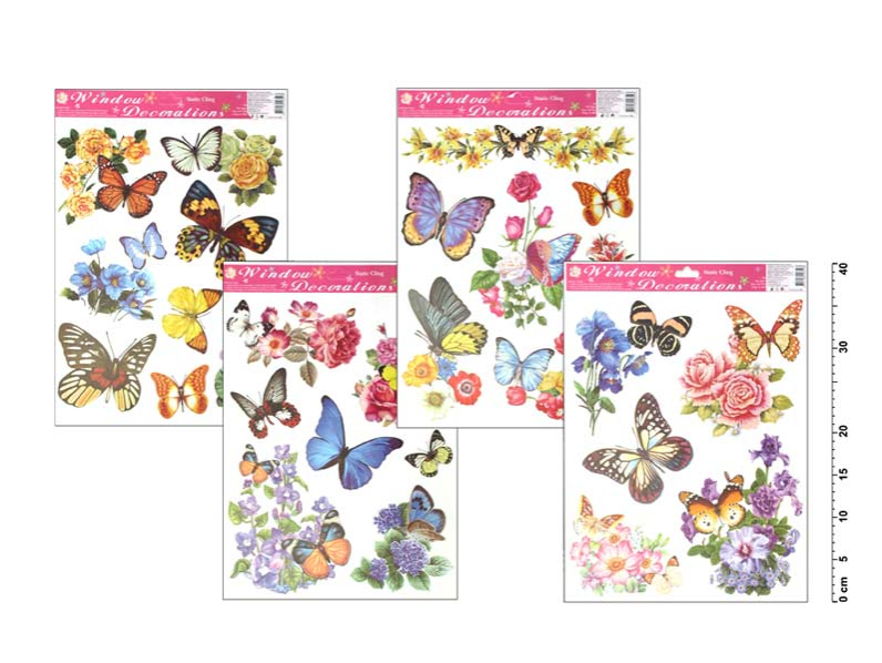 Dekoračná okenná fólia motýle a kvety. Okenné fólie neobsahujú lepidlo. Na plochu priľnú elektrostaticky a nezanechávajú teda po sebe žiadnu stopu. Vhodné sú akékoľvek hladké plochy, napríklad sklo, výlohy, zrkadlá alebo kachličky. Čisté, bez lepidla a opakovane použiteľné. NÁVOD: 1. Odporúčame pred použitím plochu očistiť od prachu a iných nečistôt. 2. Fólia sa ľahko aplikuje sňatím z podkladového papiera a umiestnením na hladkú plochu. 3. Fóliu priložte a vyhlaďte prípadné bublinky rukou alebo suchou handričkou. 4. Po použití je možné ich uložiť na pôvodný podkladový papier a uskladniť na ďalšiu sezónu. Rozmery: 420 x 300 mm Dodávame v mixe po 4 ks podľa skladovej zásoby. Uvedená cena je za 1 ks.