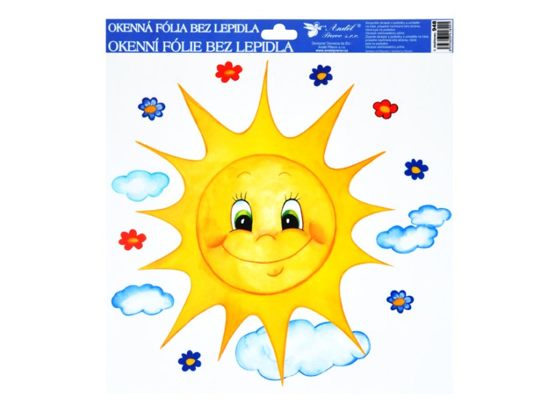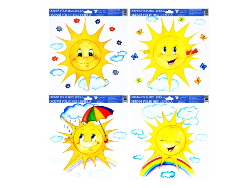 Okenná fólia – ručne maľované slniečka. Vyzdobte si okno týmito krásnymi samolepkami na okno. Vytvoria vám čarovnú atmosféru domova. Na plochu priľnú elektrostaticky a nezanechávajú teda po sebe žiadnu stopu. NÁVOD: 1. Oddeľte z podložky obrázok a umiestnite ho na čisté sklo tou stranou, ktorou bola na podložke. 2. Obrázok elektrostaticky priľne. 3. Fólia sa dá ľahko oddeliť a premiestniť. Dodávame v mixe po 4 ks podľa skladovej zásoby. Uvedená cena je za 1 ks.