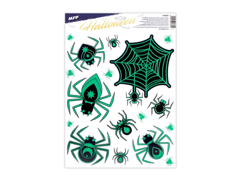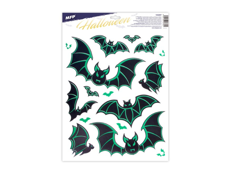 Okenná fólia svietiace Halloween s motívom pavúkov a netopierov. Vytvorí Vám tú pravú halloweensku atmosféru. Vhodné sú na akékoľvek hladké plochy, napríklad sklo, výlohy, zrkadlá alebo kachličky. Čisté, bez lepidla a opakovane použiteľné. NÁVOD: 1. Zlúpnite z podložky obrázok a umiestnite na čisté, prípadne navlhčené sklo stranou, ktorá bola na podložke. 2. Obrázok elektrostaticky priľne. 3. Fólia sa ľahko zlúpne a dá sa premiestniť. Dodávame v mixe po 2 ks podľa skladovej zásoby. Uvedená cena je za 1 ks.