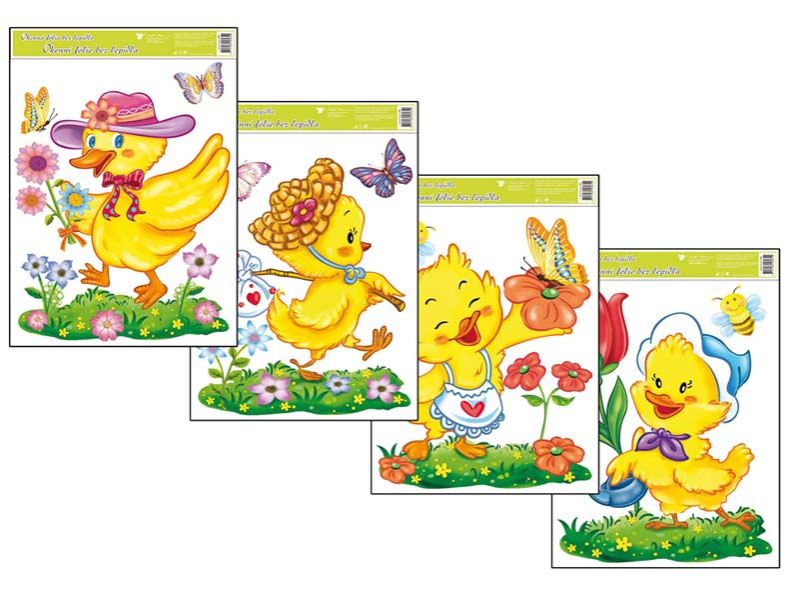 Okenná fólia bez lepidla s veľkonočnými kuriatkami. Rozmer 42x30 cm. Návod na použitie: Z podložky odlúpnite obrázok a umiestnite na čisté, prípadne navlhčené sklo stranou, ktorá bola na podložke. Obrázok elektrostaticky priľne