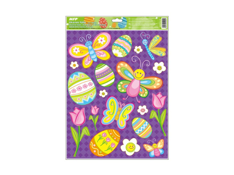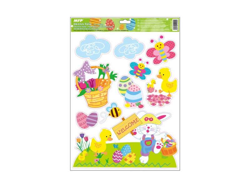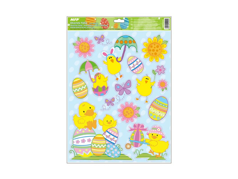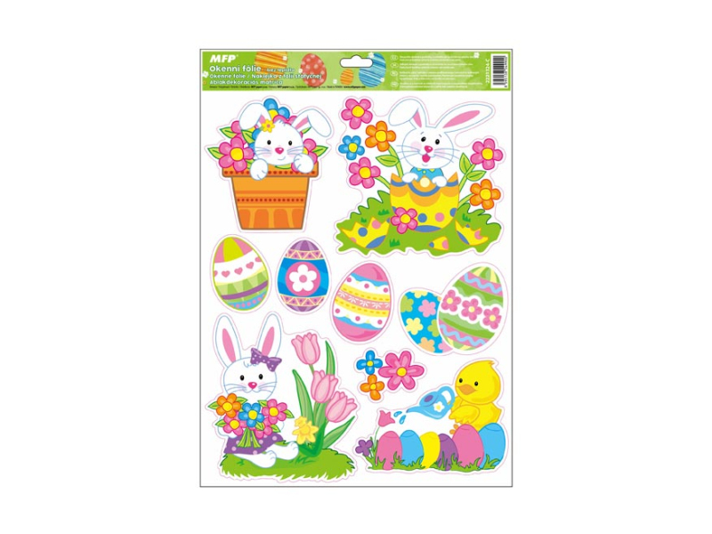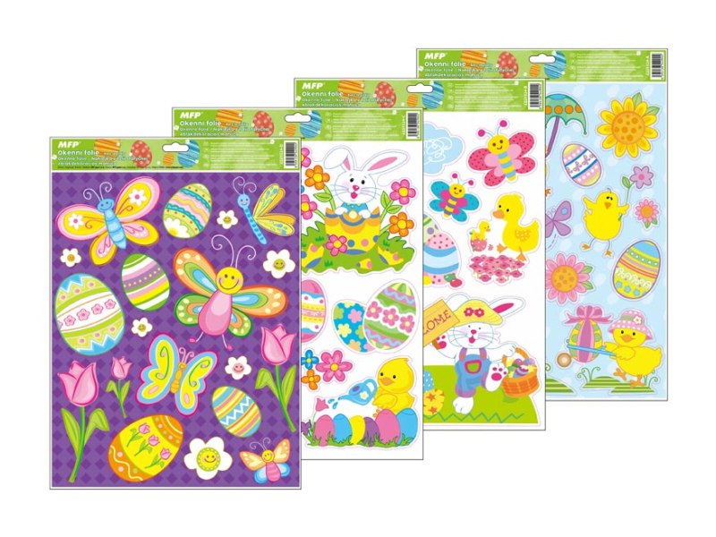 Okenná fólia veľkonočné kuriatka, vajíčka, motýliky, zajačiky. Vyzdobte si okno týmito krásnymi samolepkami na okno. Vytvoria vám kúzelnú atmosféru domova. NÁVOD: 1. Odlúpnite obrázok z podložky a umiestnite ho na čisté, prípadne navlhčené sklo tou stranou, ktorá je na podložke. 2. Obrázok elektrostaticky priľne. 3. Fólia sa dá ľahko odlúpnuť a premiestniť. Dodávame v mixe po 4 ks podľa skladových zásob. Uvedená cena je za 1 ks.