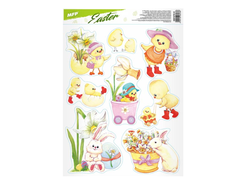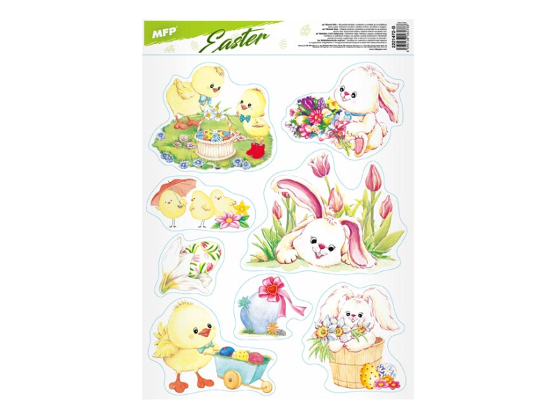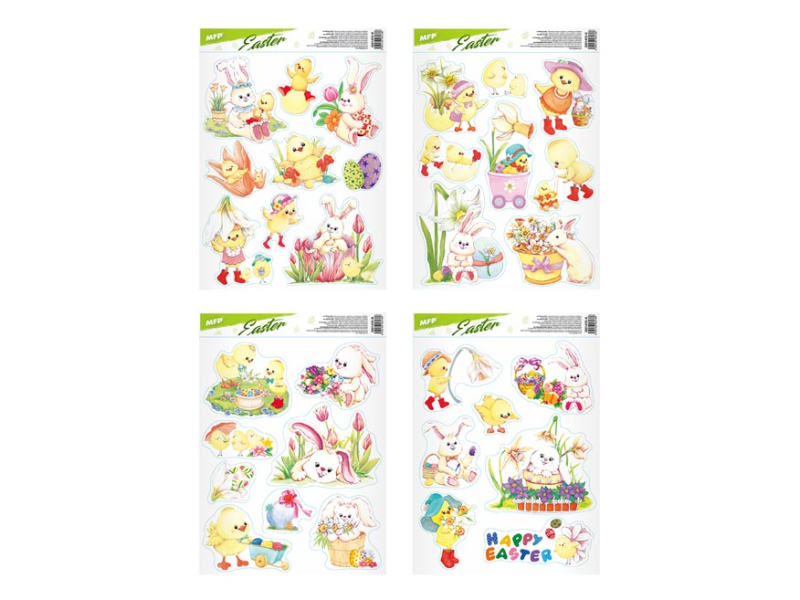 Okenná fólia bez lepidla, veľkonočné kuriatka a zajačikovia. Oslávte sviatky jari s týmito krásnymi samolepkami na okno. Vytvorí Vám kúzelnú veľkonočnú atmosféru. NÁVOD: 1. Zlúpnite obrázok z podložky a umiestnite na čisté, prípadne navlhčené sklo stranou, ktorá bola na podložke. 2. Obrázok elektrostaticky priľne. 3. Fólia sa ľahko zlúpne a dá sa premiestniť. Dodávame v mixe po 4 ks podľa skladovej zásoby. Uvedená cena je za 1 ks.
