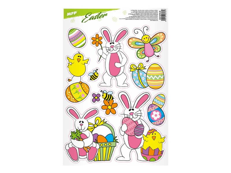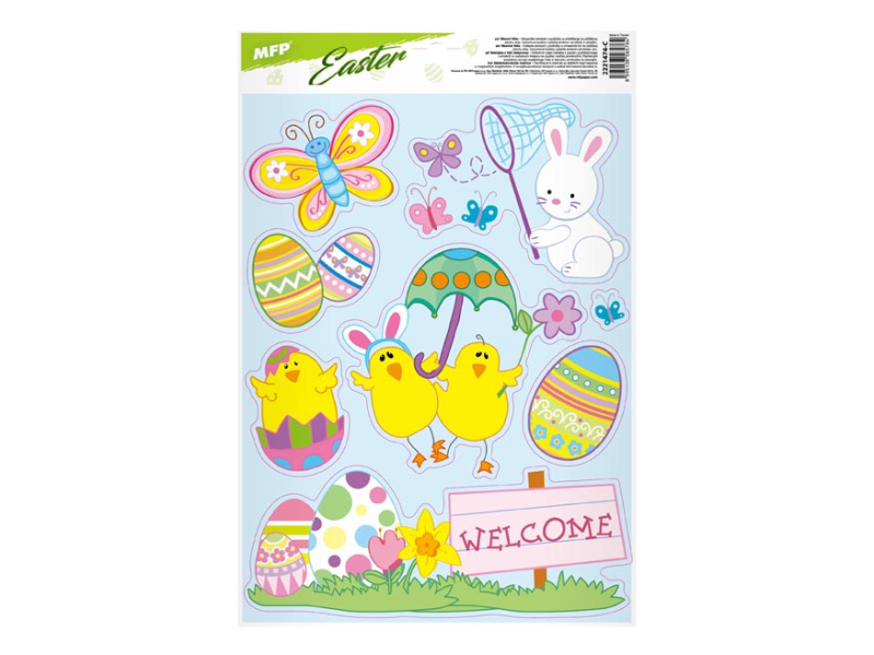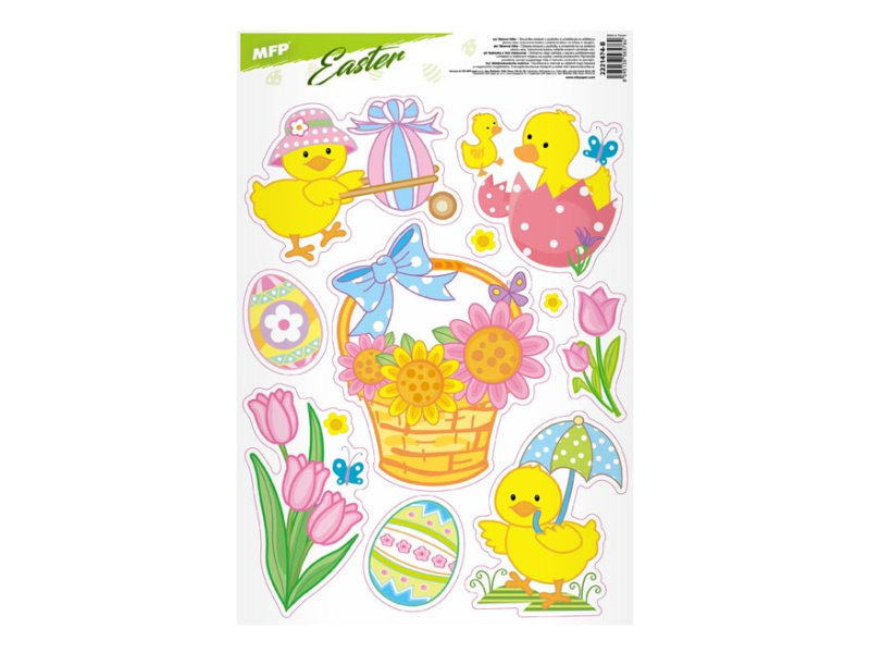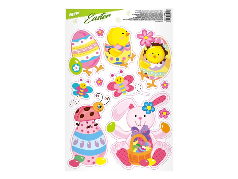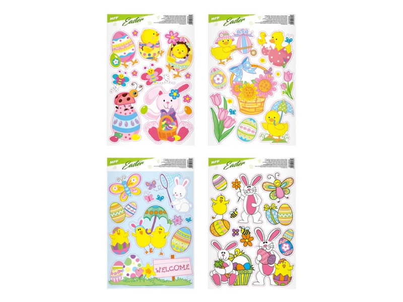 Okenná fólia bez lepidla, veľkonočné kuriatka, vajíčka, motýliky, zajačikovia. Oslávte sviatky jari s týmito krásnymi samolepkami na okno. Vytvorí Vám kúzelnú veľkonočnú atmosféru. NÁVOD: 1. Zlúpnite obrázok z podložky a umiestnite na čisté, prípadne navlhčené sklo stranou, ktorá bola na podložke. 2. Obrázok elektrostaticky priľne. 3. Fólia sa ľahko zlúpne a dá sa premiestniť. Dodávame v mixe po 4 ks podľa skladovej zásoby. Uvedená cena je za 1 ks.