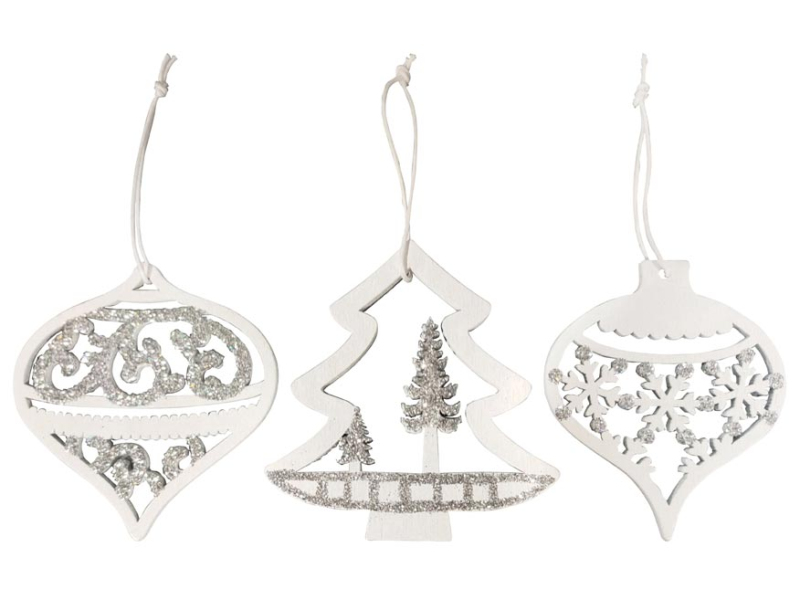 Biele drevené ozdoby s trblietkami. Krásna vianočná drevená dekorácia v dizajne bieleho stromčeka a vianočnej ozdoby slúži ako dekorácia do interiéru aj exteriéru. Táto krásna dekorácia vám navodí vianočnú atmosféru. Dekorácia má šnúrku na zavesenie. Balenie obsahuje: - 9 ks dekorácií Veľkosť: 75 mm Uvedená cena je za 1 balenie.