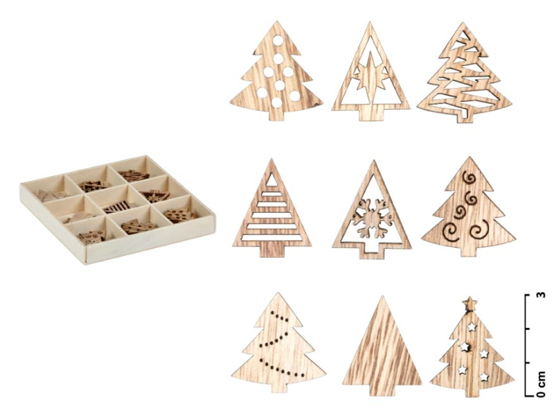 Vianočná dekorácia – 27 kúskov vianočných ozdôb v tvare stromčeka o veľkosti 30 mm. Ozdoby sú vyrezané z preglejky a uložené v darčekovej škatuľke. Rozmery ozdôb: 30 x 27 x 2 mm Rozmery škatuľky: 104 x 104 x 15 mm
