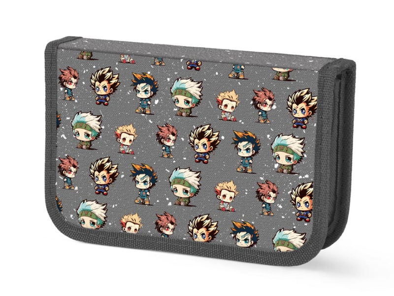 Školský jednoposchodový nevybavený peračník s dvoma chlopňami v tmavo šedej farbe s motívom anime maskotov. Chlopne majú na vonkajšej strane praktické priehľadné vrecko na rozvrh. Peračník obsahuje 23 pútok na pastelky, ceruzky a perá a 3 väčšie pútka napr. na nožnice, gumu, strúhadlo alebo pravítko. Veľmi ľahko sa uzatvára vďaka veľkému zipsu. Bezpochyby je nevyhnutnou súčasťou vybavenia každého školáka. - nie je vybavený - zdravotne nezávadný a neobsahuje toxické látky ODPORÚČANIA: - čistiť iba navlhčenou handričkou vo vode s trochou saponátu Uvedená cena je za 1 ks.
