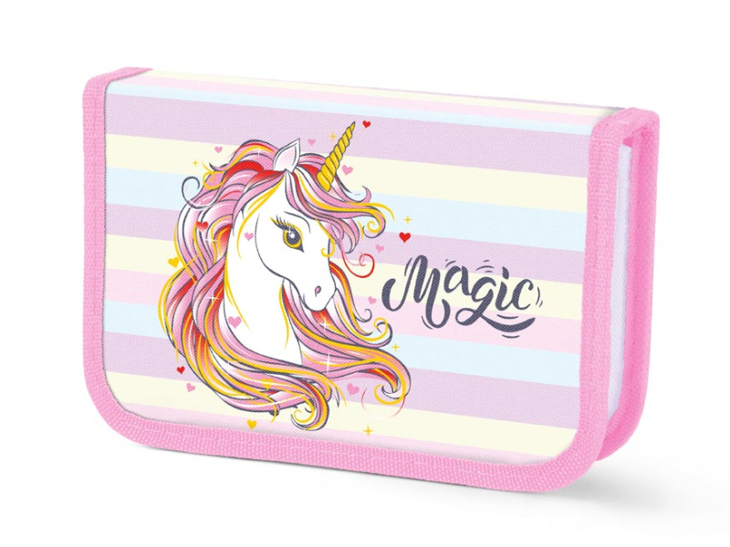 Školský jednoradový peračník s dvoma chlopňami s obrázkom jednorožca. Peračník je nevyhnutná súčasť výbavy každého školáka. Je nevybavený. Veľmi ľahko sa zatvára vďaka veľkému zipsu. Peračník obsahuje: - 25 pútok na ceruzky, nožničky, lepidlo, gumu a pravítko - rozvrh hodín - násobilku - štítok s návodom na údržbu Uvedená cena je za 1 ks. Dodávame v mixe podľa skladových zásob v 4 variantoch. - čierna s drakom - modrá s pretekárskym autom - hnedá s nápisom - modrá s triceratopsom Peračník je zdravotne neškodný, neobsahuje toxické látky.
