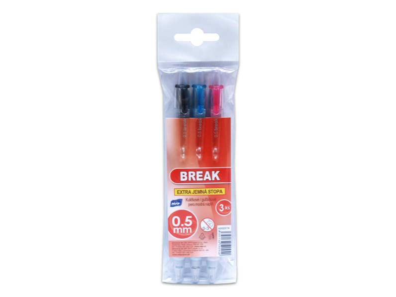 Plastové, guličkové pero BREAK s klipom - 3 ks v balení. Dĺžka: 148 mm Počet kusov v balení: 3 ks Farba: červená, modrá, čierna Prevedenie: stláčací mechanizmus Náplň: 5400171, 5400165, 5400166, 5400184, 5400185 Dodávame v sáčku so závesom. Uvedená cena je za 1 balenie.