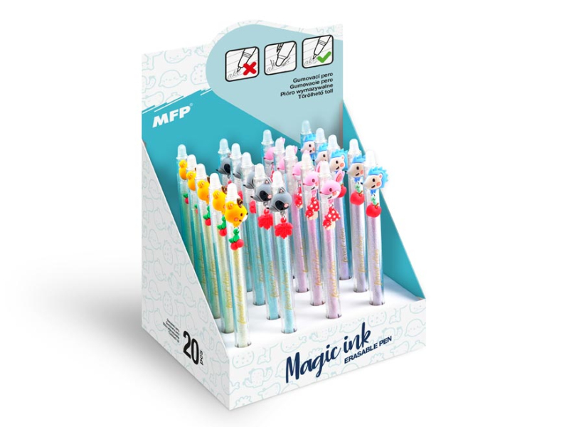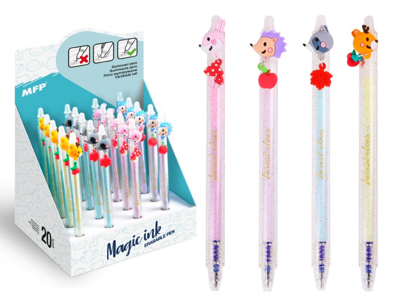 Gumovacie, guľôčkové pero s lesnými zvieratami . Obsahuje špeciálny atrament, tzv. vymaž a prepíš, alebo vymaž a nechaj to znova objaviť. Ak urobíte chybu, stačí len otočiť pero a plastovou špičkou text vymažete. Špička zahreje atrament, ten zmizne a môžeš to znova prepísať. Môžete si písať aj tajné odkazy, po vygumovaní stačí len papier schladiť pod bod mrazu a text sa znovu objaví. Toto vymazateľné pero je balené v papierovom stojane po 20 ks. Prečítajte si , na akom princípe funguje gumovacie pero. Wizard! Náplň: 0,5 mm Motív: lesné zvieratá Náplň: 5400196 modrá Počet kusov v balení: 20 ks Prevedenie: stláčací mechanizmus Dodávame v mixe po 4 ks podľa skladovej dostupnosti. Uvedená cena jeza 1 ks.