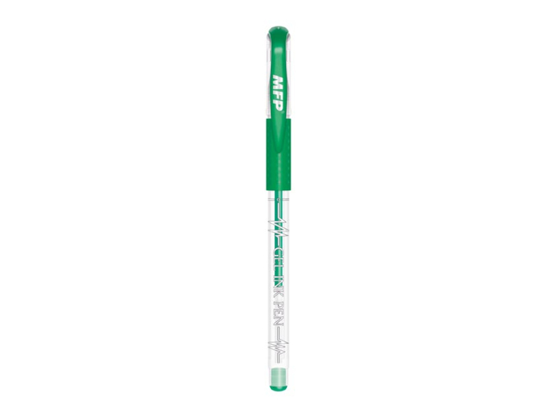 Gélové pero s hrotom 0,5 mm. Vhodné pre školské, kancelárske, ale aj domáce použitie. Gélové pero má pogumovaný úchop, a tak zabraňuje kĺzaniu v ruke. Farba: zelená Dĺžka: 150 mm Náplň: 5400152 Prevedenie: s vŕškom Počet ks v balení: 12 ks Všetkých 12 ks je balených v papierovej krabičke. Uvedená cena je za 1 ks.
