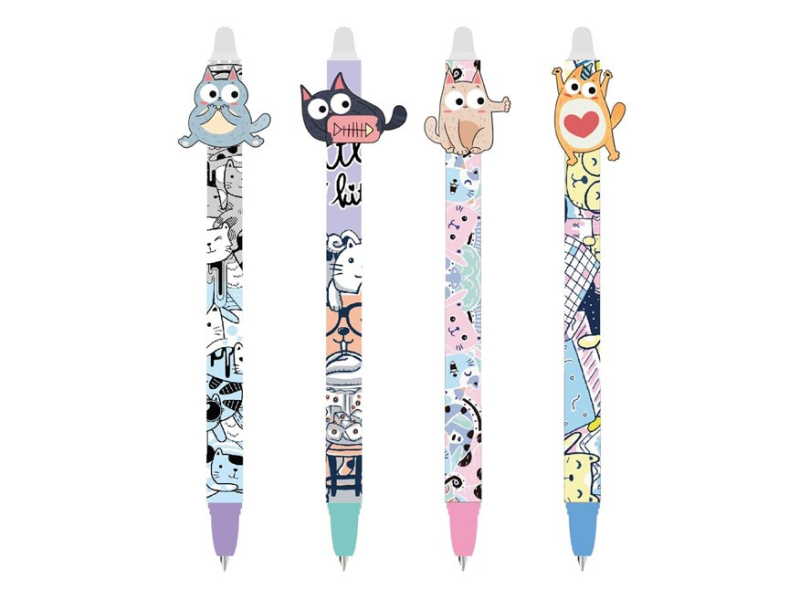 Gumovacie guľôčkové pero s motívmi mačiek obsahuje špeciálny atrament s názvom vymaž a prepíš alebo vymaž a nechaj znovu objaviť. Ak urobíte chybu, stačí pero otočiť a plastovým hrotom text vymazať. Hrot zahreje atrament, ten zmizne a dá sa znova napísať. Môžete dokonca písať tajné správy, po vymazaní stačí papier ochladiť pod bod mrazu a text sa znovu objaví. Toto gumovacie pero je balené v papierovom stojane po 20 ks. Prečítajte si, na akom princípe funguje gumovacie pero Wizard! Motív: mačky Náplň: 0,5 mm Počet kusov v balení: 36 ks Náplň: 5400196 modrá gélová Prevedenie: stláčací mechanizmus Dodávame v mixe po 4 ks podľa skladovej dostupnosti. Uvedená cena je za 1 ks.