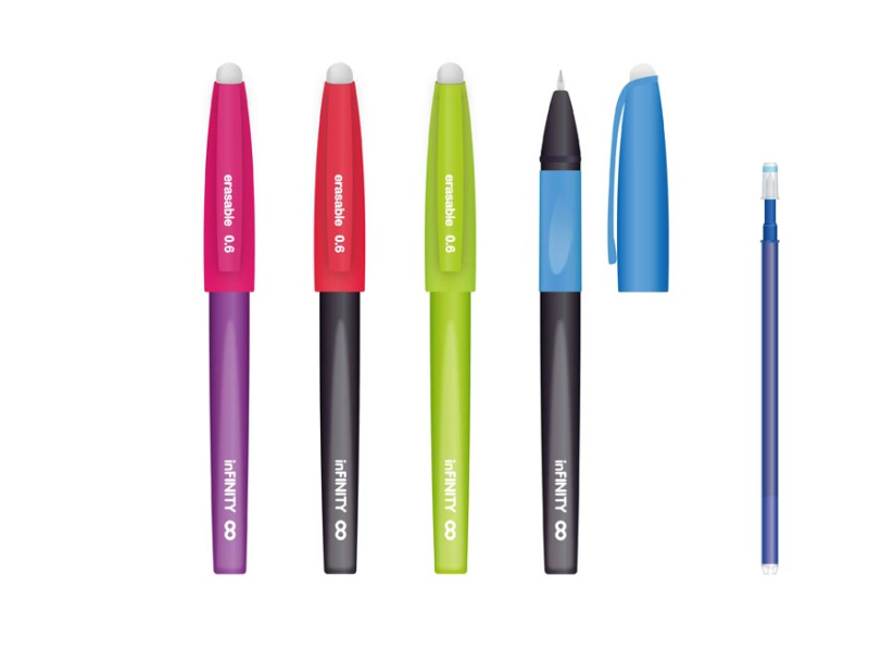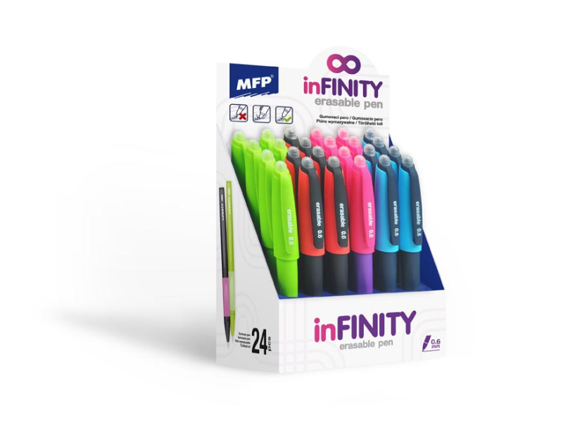 Magické, guľôčkové pero Infinity obsahuje špeciálny atrament, tzv. vymaž a prepíš, alebo vymaž a nechaj ho znovu objaviť. Ak urobíte chybu, stačí len obrátiť pero a plastovým hrotom text vymažete. Špička zahreje atrament, ten zmizne a môžeš text znova prepísať. Môžete si písať aj tajné odkazy, po vygumovaní stačí len papier schladiť pod bod mrazu a text sa znovu objaví. Vďaka novému ergonomickému dizajnu veľmi dobre padne do ruky. Na vrchu prepisovacej ceruzky je špeciálna guma na vymazanie atramentu. Hrot náplne je 0,6 mm. prečítajte si, na akom princípe funguje gumovacie pero Wizard! Dĺžka: 140 mm Náplň: 5400186 Prevedenie: s vŕškom Počet kusov v balení: 24 ks Farba : fialové telo s ružovým vŕškom, čierne telo s červeným vŕškom, zelené telo so zeleným vŕškom, čierne telo s modrým vŕškom Toto vymazateľné pero je balené po 24 ks. Dodávame v mixe 4 farieb podľa skladových zásob. Uvedená cena je za 1 ks.