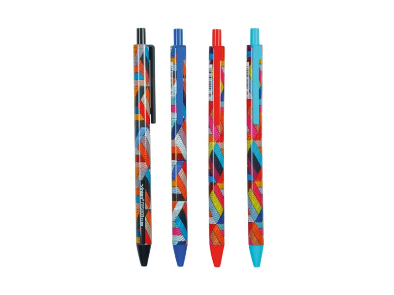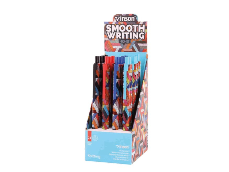 Plastové, guľôčkové pero VSN F3 s uzáverom a atramentom na olejovej báze. Tento olejový atrament poskytuje veľmi pohodlné písanie a rýchlo schne. Vhodné na použitie v škole, kancelárii aj v domácnosti. Hrot: 0,5 mm Počet kusov v balení: 24 ks Prevedenie: stláčací mechanizmus Farba: mix farieb, čierna, tmavomodrá, červená, svetlomodrá Dodávame v mixe 4 kusov podľa skladovej zásoby. Uvedená cena je za 1 ks.
