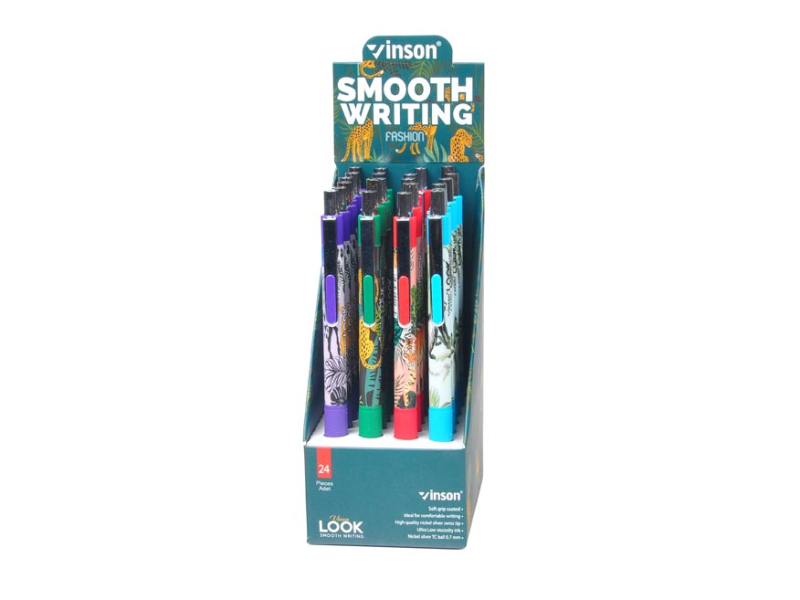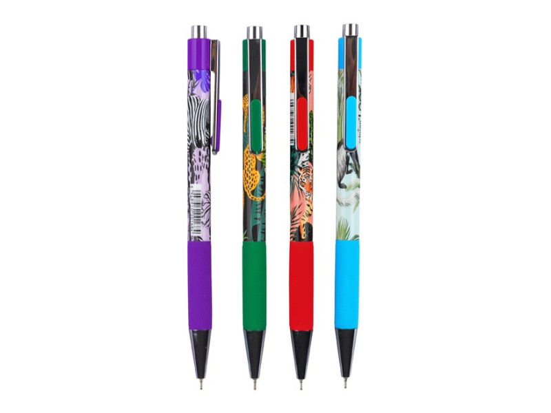 Guľôčkové pero v kombinácii farieb a motívov s 0,7 mm hrotom, ktorý zaručuje jemné a presné písanie. Pero je naplnené špeciálnym atramentom na olejovej báze, ktorý zlepšuje plynulosť písania a zároveň zabraňuje rozmazávaniu. Telo pera je zdobené rôznymi vzormi inšpirovanými divokými zvieratami, ako sú zebra, gepard, tiger alebo nosorožec. Mechanizmus pera je klikací, s kovovými koncovkami na oboch koncoch. Tento model pera je ideálny pre tých, ktorí majú radi kreatívne a farebné písacie nástroje s prírodnými motívmi. Hrot: 0,7 mm Počet kusov v balení: 24 ks Dizajn: stláčací mechanizmus Motív: zebra, gepard, tiger, nosorožec Farba: fialová, zelená, červená, modrá Dodávame v mixe po 4 ks podľa skladových zásob. Uvedená cena je za 1 ks.