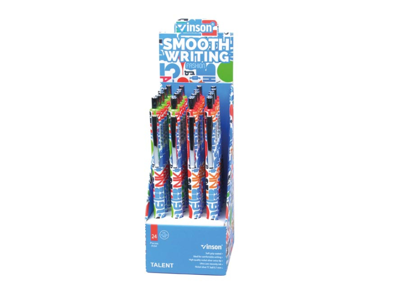 Guľôčkové pero s klikacím mechanizmom, dostupné vo farebnom dizajne s motívmi písmen. Pero má hrot hrubý 0,7 mm, ktorý zaručuje jemné a presné písanie. Telo pera je zdobené pestrými farbami. Pero je vybavené praktickým klipom, ktorý umožňuje jednoduché pripevnenie k zošitu alebo do vrecka. Ideálne na každodenné používanie a pre tých, ktorí oceňujú kreatívny a nápaditý dizajn. Hrot: 0,7 mm Motív: písmená Počet kusov v balení: 24 ks Dizajn: stláčací mechanizmus Dodávame v mixe po 2 ks podľa skladových zásob. Uvedená cena je za 1 ks.