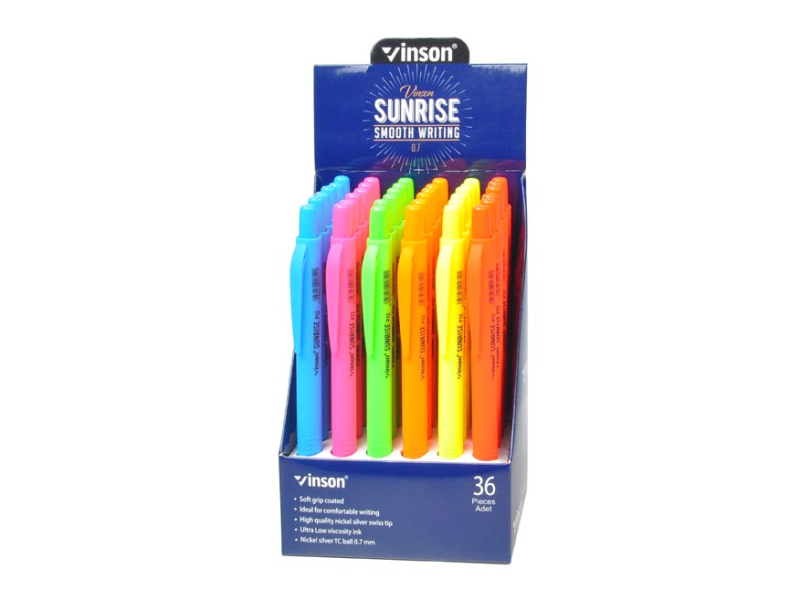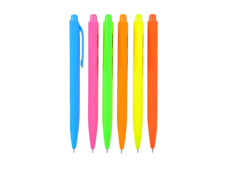 Guľôčkové pero, ktoré je k dispozícii v kombinácii žiarivých farieb s 0,7 mm hrotom, zaručuje hladké a presné písanie. Pero je naplnené špeciálnym atramentom na olejovej báze, ktorý zlepšuje plynulosť písania a zároveň zabraňuje rozmazávaniu. Ideálne na každodenné používanie v kancelárii, škole alebo doma. Hrot: 0,7 mm Počet kusov v balení: 36 ks Konštrukcia: stláčací mechanizmus Farba: modrá, neónovo ružová, neónovo zelená, neónovo oranžová, neónovo žltá, oranžová Dodávame v mixe po 6 ks podľa skladových zásob. Uvedená cena je za 1 ks.