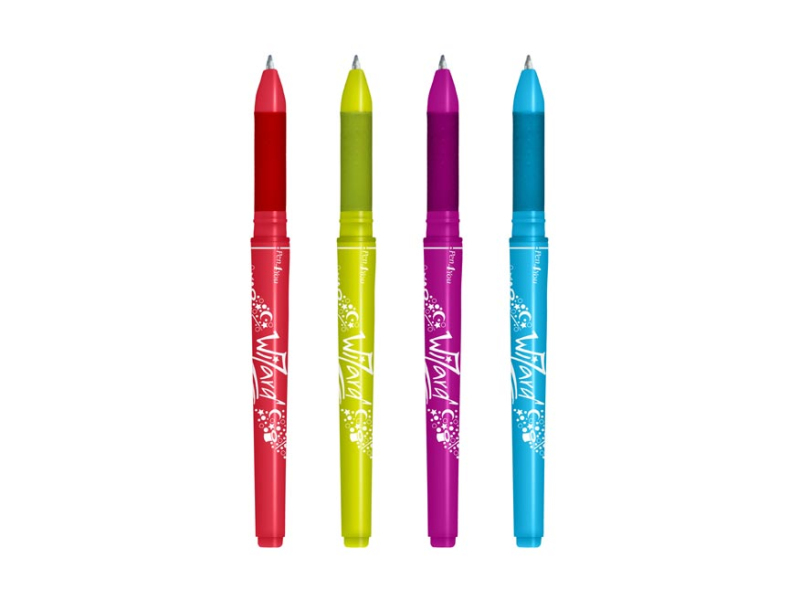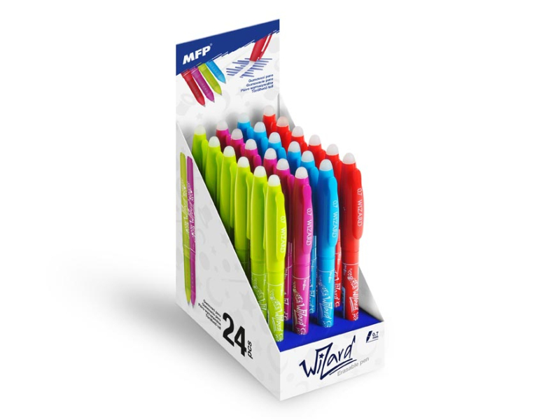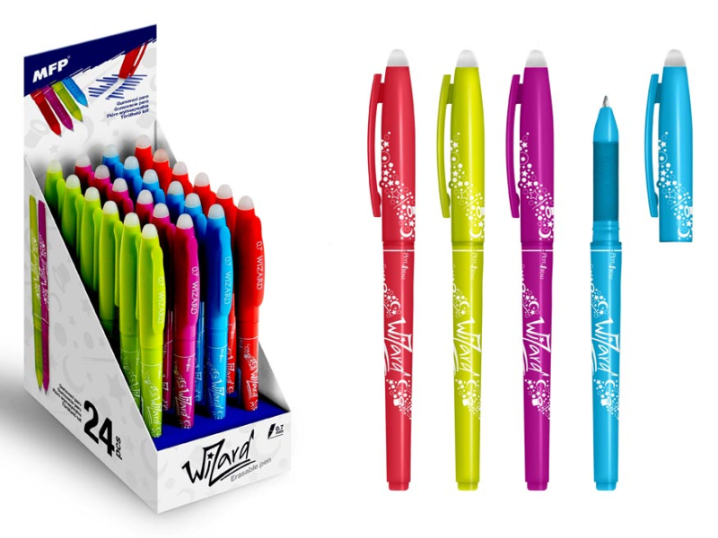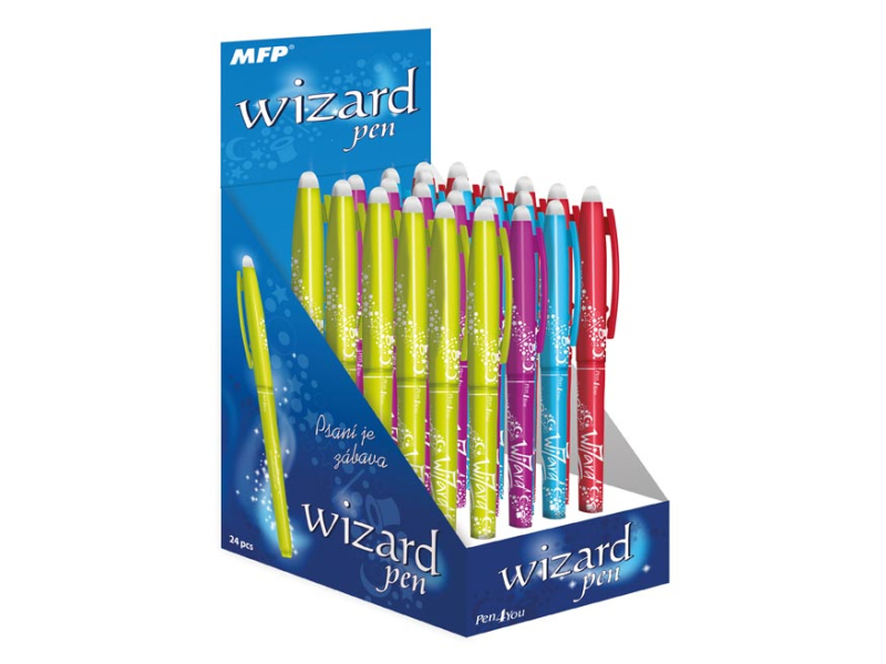 Magické, guľôčkové pero Wizard obsahuje špeciálny atrament tzv. vymaž a prepíš, alebo vymaž a nechaj znovu objaviť. Ak urobíte chybu, stačí len pero otočiť a plastovou špičkou text vymažete. Špička zahreje atrament, ten zmizne a je možné ho znova prepísať. Môžete si písať i tajné odkazy, po vygumovaní stačí len papier ochladiť pod bod mrazu a text sa znovu objaví. Toto vygumovateľné pero je balené po 24 ks v praktickom papierovom stojane. Podávame v mixe 4 farieb podľa skladových zásob. Prečítajte si, na akom princípe funguje gumovacie pero Wizard! Dĺžka: 142 mm Náplň: 0,7 mm Náplň: 5400186 Počet ks v balení: 24 ks Prevedenie: s vŕškom Farba: čierna, modrá, zelená, fialová Táto vymazateľná pera sú balená po 24 ks v praktickom papierovom stojane. Dodávame v mixe 4 farieb podľa skladovej zásoby. Uvedená cena je za 1 ks.
