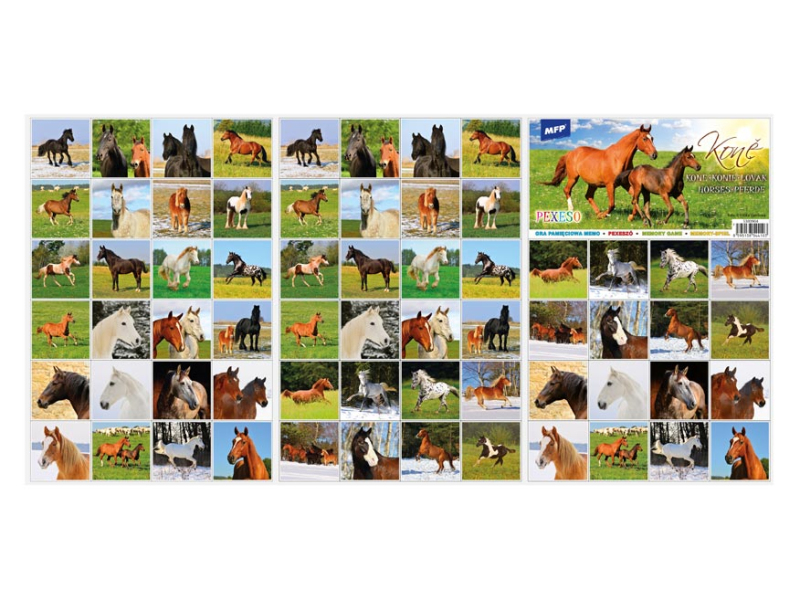 Populárna detská stolová hra pexeso pre malé deti s obrázkami koní. Hra obsahuje 32 dvojíc obrázkov veľkosti 51x51 mm. Vynikajúca učebná pomôcka pre deti aj pre rodičov. Naučte svoje deti základné anglické slovíčka a precvičujte ich pamäť. Vedeli ste, že slovo „pexeso“ vzniklo zo slov PEKELNĚ SE SOUSTŘEĎ? Návod na hru pexeso: Pexeso môžu hrať najmenej dvaja hráči. Všetky rozstrihané kartičky zamiešajú a rozložia obrázkom nadol do štvorca 8 x 8 kartičiek. Nesmú sa pri tom pozerať na obrázok. Hráči si určia poradie hry. Hráč otočí dve ľubovoľné kartičky tak, aby si aj ostatní spoluhráči mohli obrázky a ich umiestenie zapamätať. Ak kartičky nemajú rovnaké obrázky, otočí ich a vráti na pôvodné miesto. Pokračuje ďalší hráč, ktorý je na rade. Ak objaví rovnaké obrázky, získava bod a obe kartičky vyradí z hry. Pokračuje do tej chvíle, kedy otočí dva rôzne obrázky. Vyhráva hráč, ktorý získa viac bodov. Rozmer kartičky: 51x51 mm Rozměr pexesa: 3 x A4 Papier krieda matná 350g + lamino lesk 1/1. Vhodné pre deti od 3 rokov. Nebezpečenstvo vdýchnutia a prehĺtnutia malých častí.