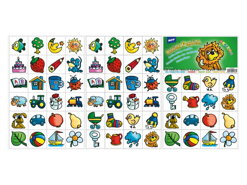 Populárna detská stolová hra pexeso pre malé deti s názvom Lvíček Pepíček. Hra obsahuje 32 dvojíc obrázkov veľkosti 51x51 mm. Vynikajúca učebná pomôcka pre deti aj pre rodičov. Naučte svoje deti základné anglické slovíčka a precvičujte ich pamäť. Vedeli ste, že slovo „pexeso“ vzniklo zo slov PEKELNĚ SE SOUSTŘEĎ? Návod na hru pexeso: Pexeso môžu hrať najmenej dvaja hráči. Všetky rozstrihané kartičky zamiešajú a rozložia obrázkom nadol do štvorca 8 x 8 kartičiek. Nesmú sa pri tom pozerať na obrázok. Hráči si určia poradie hry. Hráč otočí dve ľubovoľné kartičky tak, aby si aj ostatní spoluhráči mohli obrázky a ich umiestenie zapamätať. Ak kartičky nemajú rovnaké obrázky, otočí ich a vráti na pôvodné miesto. Pokračuje ďalší hráč, ktorý je na rade. Ak objaví rovnaké obrázky, získava bod a obe kartičky vyradí z hry. Pokračuje do tej chvíle, kedy otočí dva rôzne obrázky. Vyhráva hráč, ktorý získa viac bodov. Rozmer kartičky: 51x51 mm Rozměr pexesa: 3 x A4 Papier krieda matná 350g + lamino lesk 1/1. Vhodné pre deti od 3 rokov. Nebezpečenstvo vdýchnutia a prehĺtnutia malých častí.
