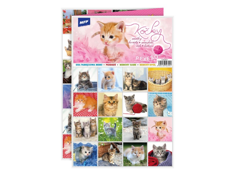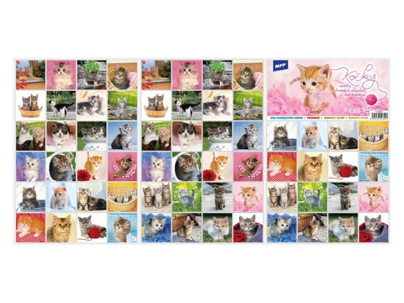 Populárna detská stolová hra pexeso pre malé deti s obrázkami mačiek. Hra obsahuje 32 dvojíc obrázkov veľkosti 51x51 mm. Vynikajúca učebná pomôcka pre deti aj pre rodičov. Naučte svoje deti základné anglické slovíčka a precvičujte ich pamäť. Vedeli ste, že slovo „pexeso“ vzniklo zo slov PEKELNĚ SE SOUSTŘEĎ? Návod na hru pexeso: Pexeso môžu hrať najmenej dvaja hráči. Všetky rozstrihané kartičky zamiešajú a rozložia obrázkom nadol do štvorca 8 x 8 kartičiek. Nesmú sa pri tom pozerať na obrázok. Hráči si určia poradie hry. Hráč otočí dve ľubovoľné kartičky tak, aby si aj ostatní spoluhráči mohli obrázky a ich umiestenie zapamätať. Ak kartičky nemajú rovnaké obrázky, otočí ich a vráti na pôvodné miesto. Pokračuje ďalší hráč, ktorý je na rade. Ak objaví rovnaké obrázky, získava bod a obe kartičky vyradí z hry. Pokračuje do tej chvíle, kedy otočí dva rôzne obrázky. Vyhráva hráč, ktorý získa viac bodov. Rozmer kartičky: 51x51 mm Rozměr pexesa: 3 x A4 Papier krieda matná 350g + lamino lesk 1/1. Vhodné pre deti od 3 rokov. Nebezpečenstvo vdýchnutia a prehĺtnutia malých častí.