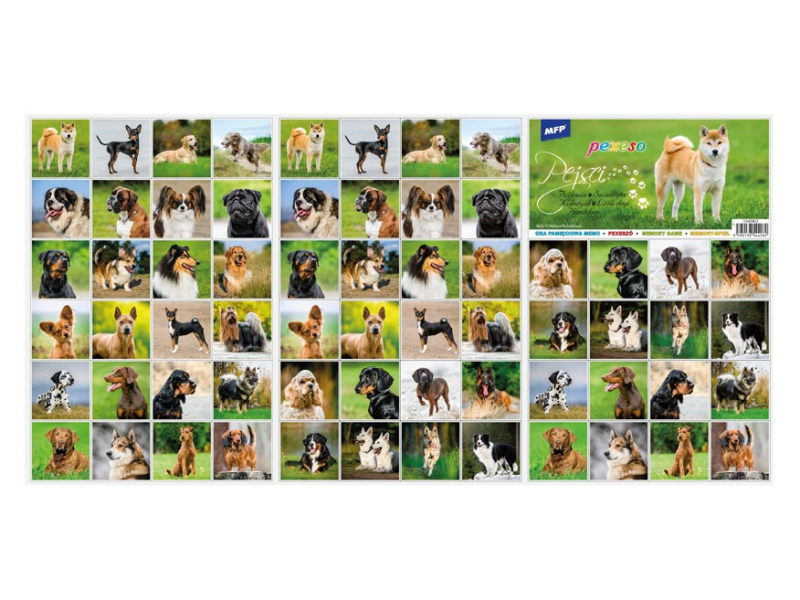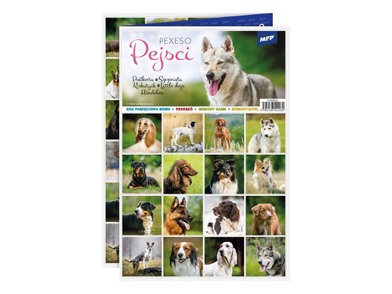 Populárna, detská, stolová hra pexeso pre malé deti s nazvom psíkovia. Hra obsahuje 32 dvojíc obrázkov veľkosti 51x51 mm. Vynikajúca učebná pomôcka pre deti aj pre rodičov. Naučte svoje deti základné anglické slovíčka a precvičujte ich pamäť. Vedeli ste, že slovo „pexeso“ vzniklo zo slov PEKELNĚ SE SOUSTŘEĎ? Návod na hru pexeso: Pexeso môžu hrať najmenej dvaja hráči. Všetky rozstrihané kartičky zamiešajú a rozložia obrázkom nadol do štvorca 8 x 8 kartičiek. Nesmú sa pri tom pozerať na obrázok. Hráči si určia poradie hry. Hráč otočí dve ľubovoľné kartičky tak, aby si aj ostatní spoluhráči mohli obrázky a ich umiestenie zapamätať. Ak kartičky nemajú rovnaké obrázky, otočí ich a vráti na pôvodné miesto. Pokračuje ďalší hráč, ktorý je na rade. Ak objaví rovnaké obrázky, získava bod a obe kartičky vyradí z hry. Pokračuje do tej chvíle, kedy otočí dva rôzne obrázky. Vyhráva hráč, ktorý získa viac bodov. Rozmer kartičky: 51x51 mm Rozměr pexesa: 3 x A4 Papier krieda matná 350g + lamino lesk 1/1. Vhodné pre deti od 3 rokov. Nebezpečenstvo vdýchnutia a prehĺtnutia malých častí. Uvedená cena je za 1 ks.