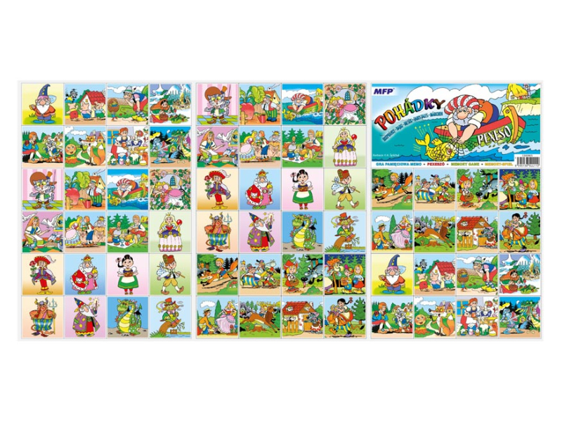 Populárna detská stolová hra pexeso pre malé deti s nazvom rozprávky. Hra obsahuje 32 dvojíc obrázkov veľkosti 51x51 mm. Vynikajúca učebná pomôcka pre deti aj pre rodičov. Naučte svoje deti základné anglické slovíčka a precvičujte ich pamäť. Vedeli ste, že slovo „pexeso“ vzniklo zo slov PEKELNĚ SE SOUSTŘEĎ? Návod na hru pexeso: Pexeso môžu hrať najmenej dvaja hráči. Všetky rozstrihané kartičky zamiešajú a rozložia obrázkom nadol do štvorca 8 x 8 kartičiek. Nesmú sa pri tom pozerať na obrázok. Hráči si určia poradie hry. Hráč otočí dve ľubovoľné kartičky tak, aby si aj ostatní spoluhráči mohli obrázky a ich umiestenie zapamätať. Ak kartičky nemajú rovnaké obrázky, otočí ich a vráti na pôvodné miesto. Pokračuje ďalší hráč, ktorý je na rade. Ak objaví rovnaké obrázky, získava bod a obe kartičky vyradí z hry. Pokračuje do tej chvíle, kedy otočí dva rôzne obrázky. Vyhráva hráč, ktorý získa viac bodov. Rozmer kartičky: 51x51 mm Rozměr pexesa: 3 x A4 Papier krieda matná 350g + lamino lesk 1/1. Vhodné pre deti od 3 rokov. Nebezpečenstvo vdýchnutia a prehĺtnutia malých častí.