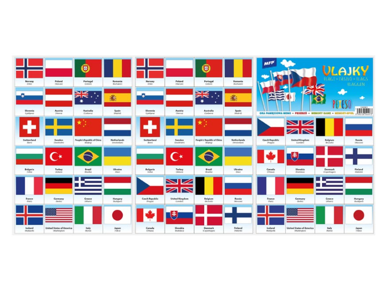 Populárna detská stolová hra pexeso pre malé deti s nazvom vlajky. Hra obsahuje 32 dvojíc obrázkov veľkosti 51x51 mm. Vynikajúca učebná pomôcka pre deti aj pre rodičov. Naučte svoje deti základné anglické slovíčka a precvičujte ich pamäť. Vedeli ste, že slovo „pexeso“ vzniklo zo slov PEKELNĚ SE SOUSTŘEĎ? Návod na hru pexeso: Pexeso môžu hrať najmenej dvaja hráči. Všetky rozstrihané kartičky zamiešajú a rozložia obrázkom nadol do štvorca 8 x 8 kartičiek. Nesmú sa pri tom pozerať na obrázok. Hráči si určia poradie hry. Hráč otočí dve ľubovoľné kartičky tak, aby si aj ostatní spoluhráči mohli obrázky a ich umiestenie zapamätať. Ak kartičky nemajú rovnaké obrázky, otočí ich a vráti na pôvodné miesto. Pokračuje ďalší hráč, ktorý je na rade. Ak objaví rovnaké obrázky, získava bod a obe kartičky vyradí z hry. Pokračuje do tej chvíle, kedy otočí dva rôzne obrázky. Vyhráva hráč, ktorý získa viac bodov. Rozmer kartičky: 51x51 mm Rozměr pexesa: 3 x A4 Papier krieda matná 350g + lamino lesk 1/1. Vhodné pre deti od 3 rokov. Nebezpečenstvo vdýchnutia a prehĺtnutia malých častí.