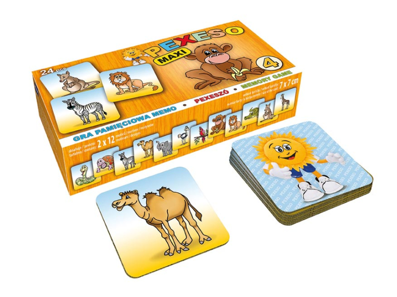 Pexeso pre malé deti s obrázkami zvierat v ZOO. Táto kartová hra obsahuje 12 dvojíc obrázkov – had, korytnačka, zebra, ťava, slon, pštros, papagáj, opica, lev, krokodíl, klokan, žirafa. Pexeso je vyrobené z 3 mm silného materiálu aby ho malé deti mohli lepšie chytiť a otočiť. Hracie kartičky sú veľké 7 x 7 cm. Výborná učebná pomôcka pre deti a rodičov. Naučte svoje deti mená zvieratiek v ZOO a precvičujte ich pamäť. Vedeli ste, že slovo PEXESO vzniklo spojením slov PEKELNE SA SÚSTREĎ? https://cs.wikipedia.org/wiki/Pexeso Návod na hru pexeso: Pexeso môžu hrať najmenej dvaja hráči. Všetky rozstrihané kartičky zamiešajú a rozložia obrázkom nadol. Nesmú sa pri tom pozerať na obrázok. Hráči si určia poradie hry. Hráč otočí dve ľubovoľné kartičky tak, aby si aj ostatní spoluhráči mohli obrázky a ich umiestenie zapamätať. Ak kartičky nemajú rovnaké obrázky, otočí ich a vráti na pôvodné miesto. Pokračuje ďalší hráč, ktorý je na rade. Ak objaví rovnaké obrázky, získava bod a obe kartičky vyradí z hry. Pokračuje do tej chvíle, kedy otočí dva rôzne obrázky. Vyhráva hráč, ktorý získa viac bodov. Vhodné pre deti od 3 rokov. Nebezpečenstvo vdýchnutia a prehĺtnutia malých častí.