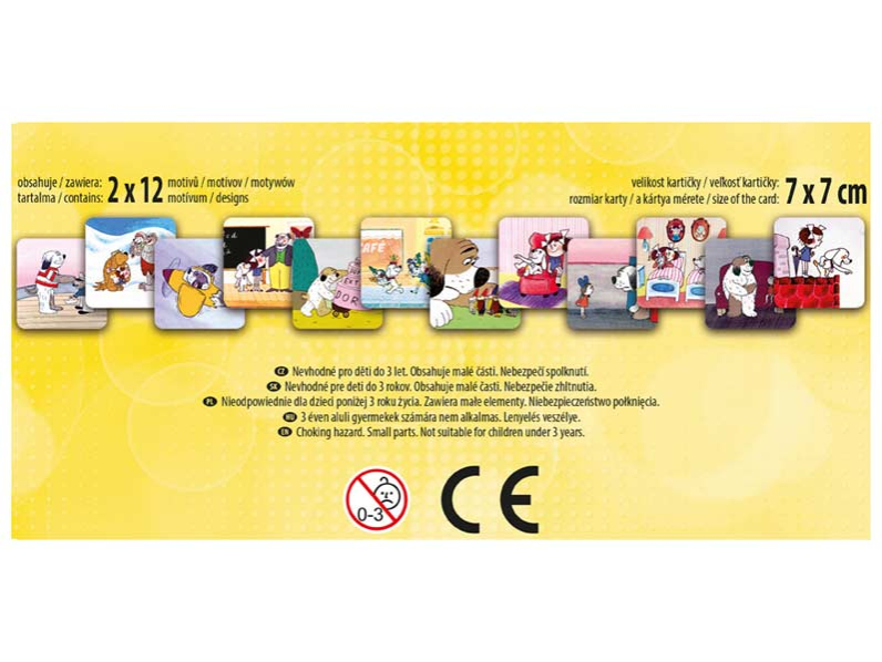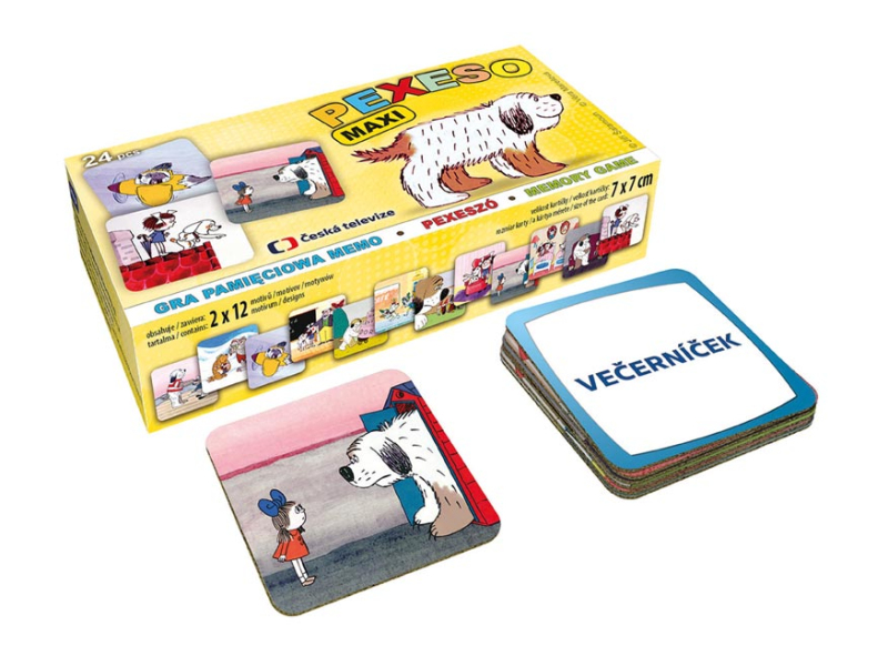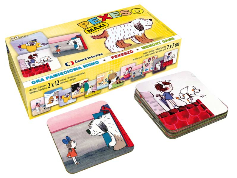Pexeso pre malé deti s obrázkami Maxipes Fík a Káťa a Škubánek. Táto kartová hra obsahuje 12 dvojíc obrázkov. Pexeso je vyrobené z 3 mm silného materiálu aby ho malé deti mohli lepšie chytiť a otočiť. Hracie kartičky sú veľké 7 x 7 cm. Výborná učebná pomôcka pre deti a rodičov. Vedeli ste, že slovo PEXESO vzniklo spojením slov PEKELNE SA SÚSTREĎ? Návod na hru pexeso: Pexeso môžu hrať najmenej dvaja hráči. Všetky rozstrihané kartičky zamiešajú a rozložia obrázkom nadol. Nesmú sa pri tom pozerať na obrázok. Hráči si určia poradie hry. Hráč otočí dve ľubovoľné kartičky tak, aby si aj ostatní spoluhráči mohli obrázky a ich umiestenie zapamätať. Ak kartičky nemajú rovnaké obrázky, otočí ich a vráti na pôvodné miesto. Pokračuje ďalší hráč, ktorý je na rade. Ak objaví rovnaké obrázky, získava bod a obe kartičky vyradí z hry. Pokračuje do tej chvíle, kedy otočí dva rôzne obrázky. Vyhráva hráč, ktorý získa viac bodov. Vhodné pre deti od 3 rokov. Nebezpečenstvo vdýchnutia a prehĺtnutia malých častí.