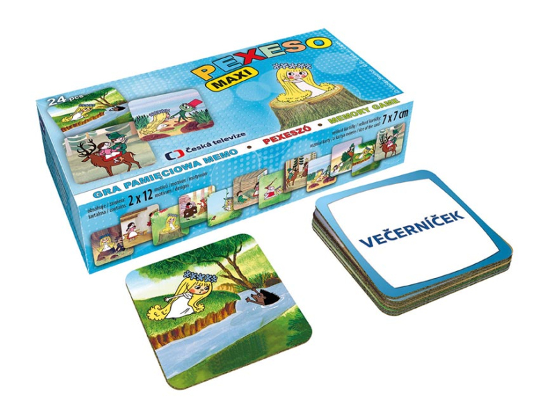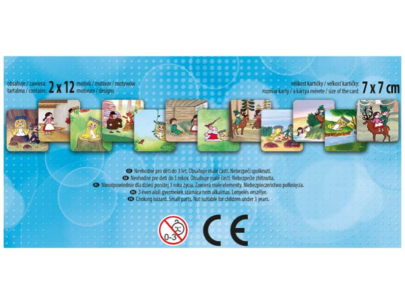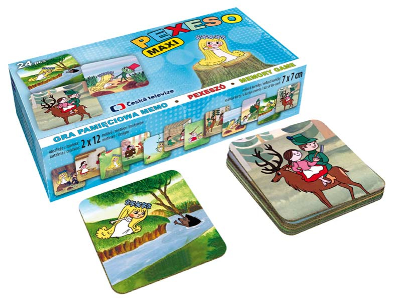 Pexeso pre malé deti s obrázkami víla Amálka + horár Robátko. Táto kartová hra obsahuje 12 dvojíc obrázkov. Pexeso je vyrobené z 3 mm silného materiálu aby ho malé deti mohli lepšie chytiť a otočiť. Hracie kartičky sú veľké 7 x 7 cm. Výborná učebná pomôcka pre deti a rodičov. Vedeli ste, že slovo PEXESO vzniklo spojením slov PEKELNE SA SÚSTREĎ? Návod na hru pexeso: Pexeso môžu hrať najmenej dvaja hráči. Všetky rozstrihané kartičky zamiešajú a rozložia obrázkom nadol. Nesmú sa pri tom pozerať na obrázok. Hráči si určia poradie hry. Hráč otočí dve ľubovoľné kartičky tak, aby si aj ostatní spoluhráči mohli obrázky a ich umiestenie zapamätať. Ak kartičky nemajú rovnaké obrázky, otočí ich a vráti na pôvodné miesto. Pokračuje ďalší hráč, ktorý je na rade. Ak objaví rovnaké obrázky, získava bod a obe kartičky vyradí z hry. Pokračuje do tej chvíle, kedy otočí dva rôzne obrázky. Vyhráva hráč, ktorý získa viac bodov. Vhodné pre deti od 3 rokov. Nebezpečenstvo vdýchnutia a prehĺtnutia malých častí.
