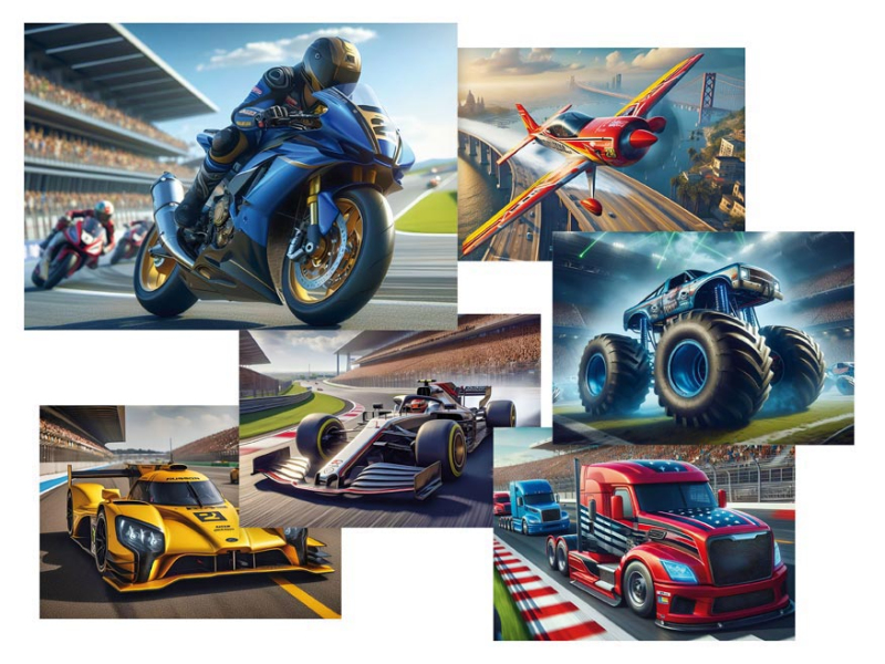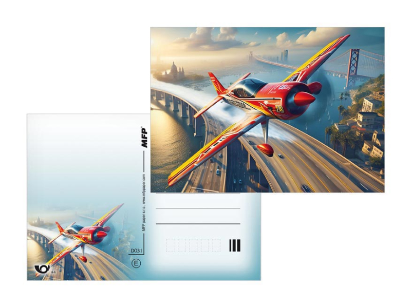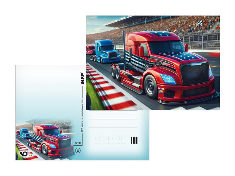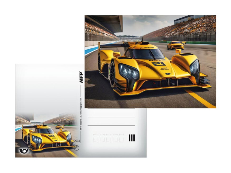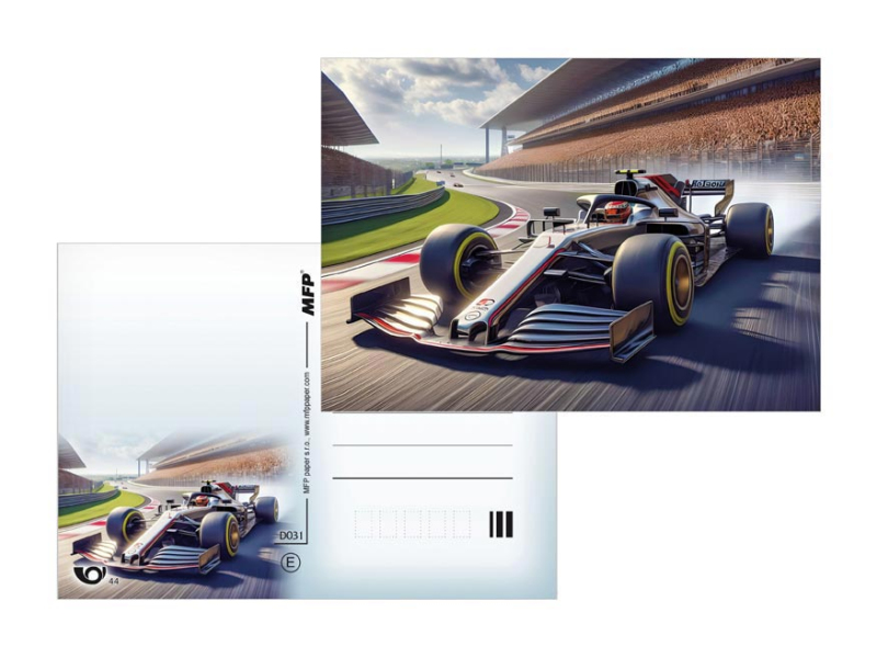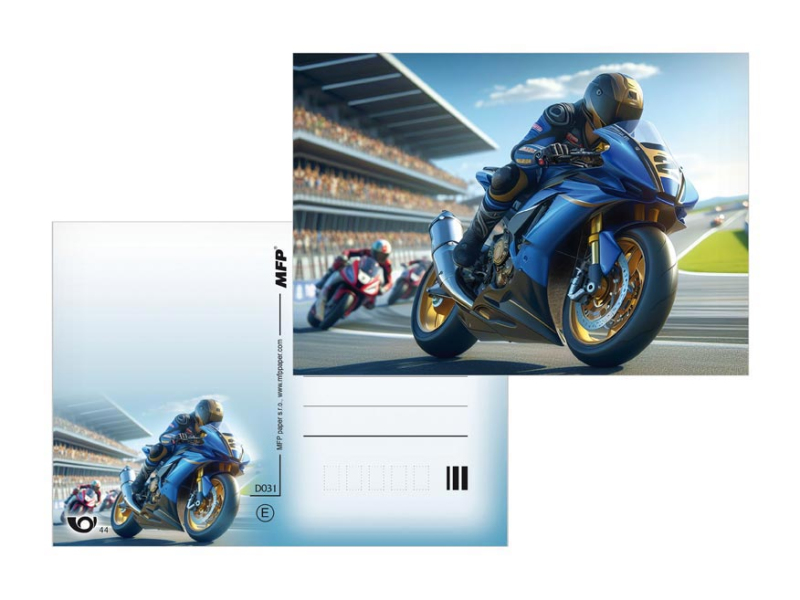 Pohľadnica s motívmi z rôznych pretekárskych prostredí (motorky, lietadlo, formula...). Pohľadnice sú bez textu na zadnej strane. Text: 0/6 Povrchová úprava: UV lak Papier: pohľadnicový kartón 240 g Dodávame v mixe po 6 ks podľa skladových zásob. Uvedená cena je za 1 ks.
